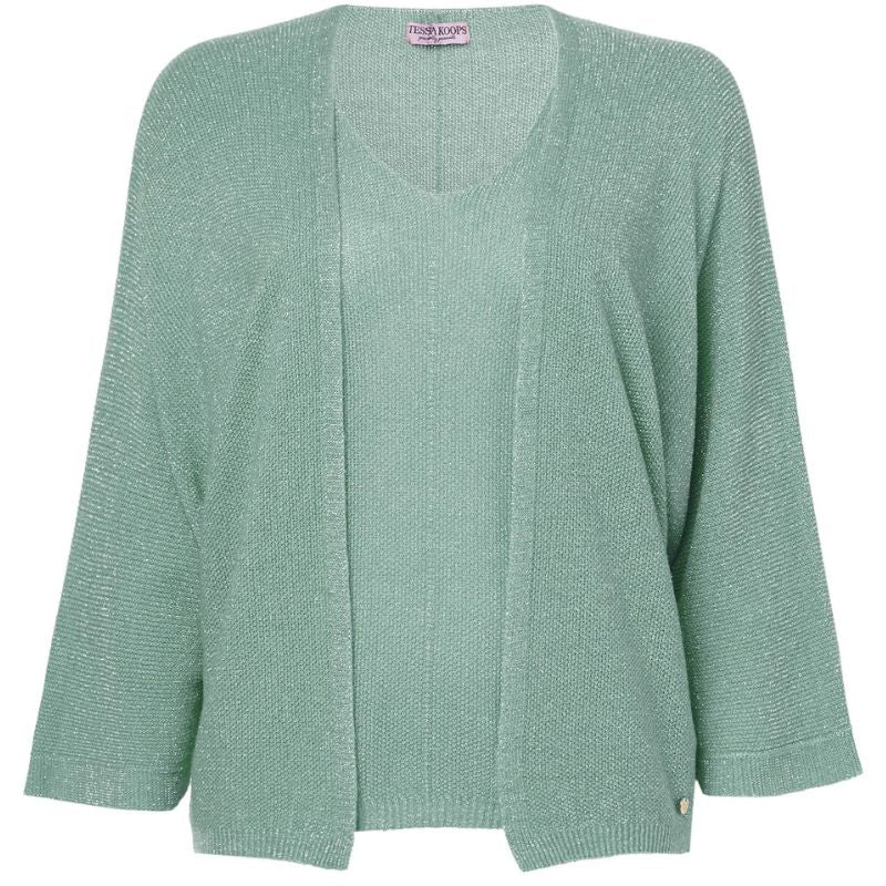 Groene twin set van Tessa Koops voor dames. Deze stijlvolle twin set bestaat uit een gebreide trui met v-hals en een bijpassend vest, beide in een zachte groene tint. Subtiele gouden glitterdetails geven de set een elegante uitstraling. Gemaakt van een comfortabele mix van 20% alpaca, 35% polyamide en 45% acryl, biedt deze set warmte en stijl op koelere dagen. Verkrijgbaar in het groen en roze.