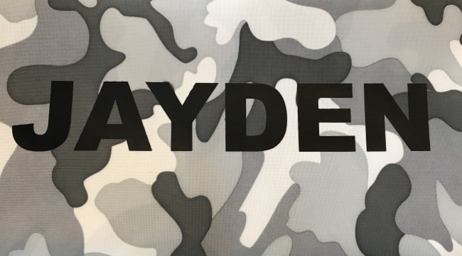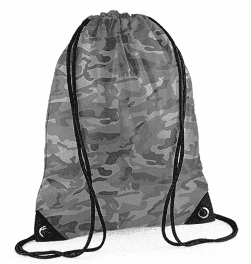 Mooie camouflage gymtas met naam, leuk met fluor opdruk of een andere kleur.