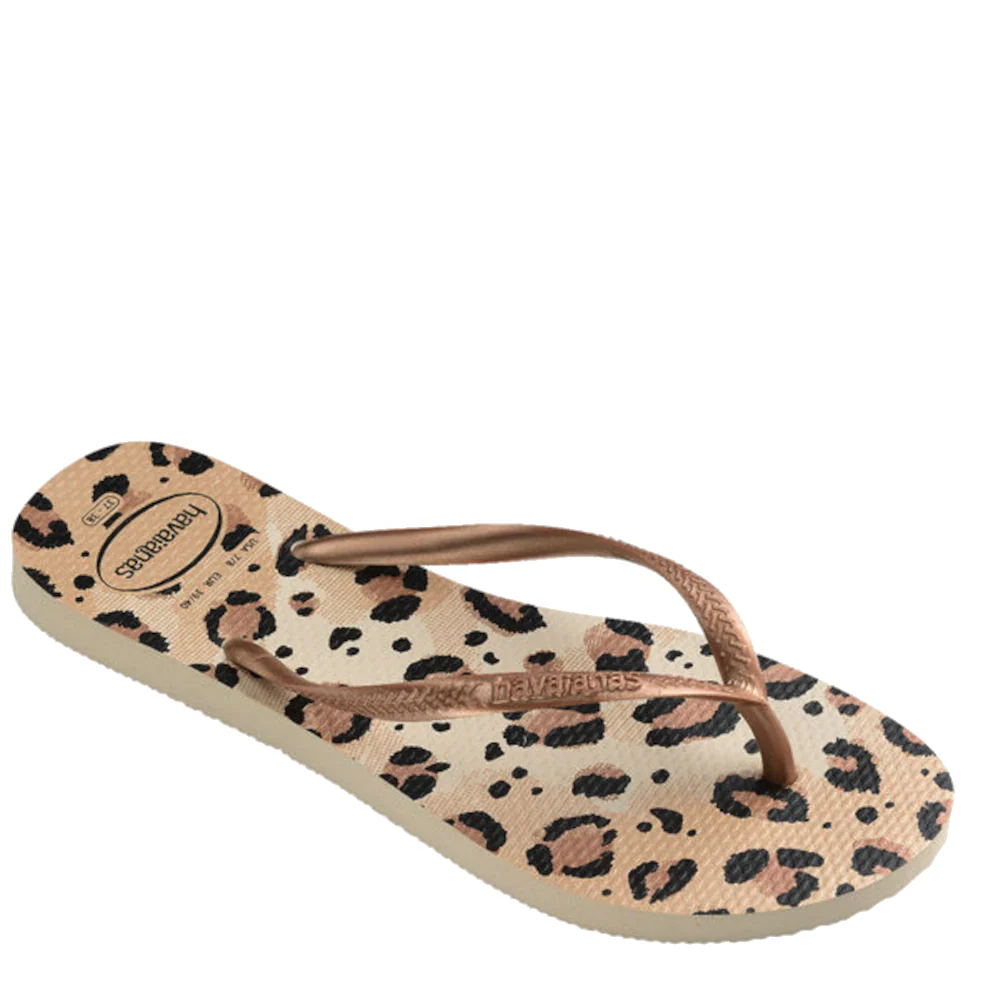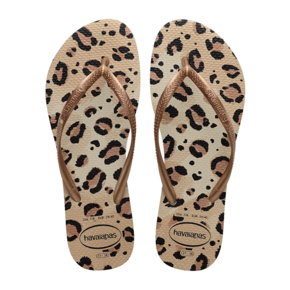 Ontdek de perfecte combinatie van comfort, duurzaamheid en stijl met de Havaianas Slim Animals Beige slippers. Deze dames-slippers zijn ontworpen om je voeten de hele dag door een gevoel van lichtheid en ondersteuning te bieden. De smalle, stijlvolle bandjes en de tijdloze dierenprint zorgen voor een elegante uitstraling, terwijl de metallic glans een vleugje glamour toevoegt. Of je nu een dagje naar het strand gaat of een casual uitje plant, deze slippers maken je outfit compleet.