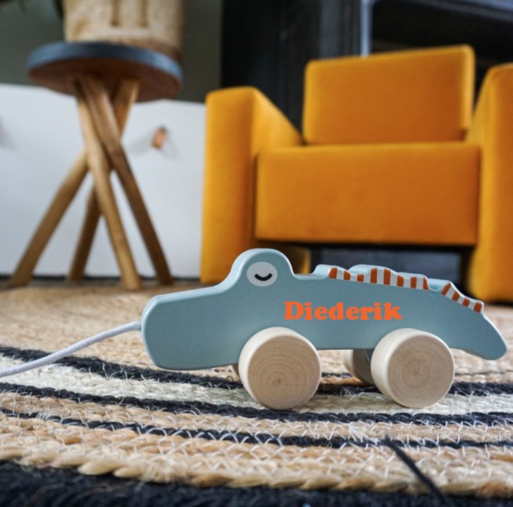 De trek krokodil kan bestickerd worden met naam!