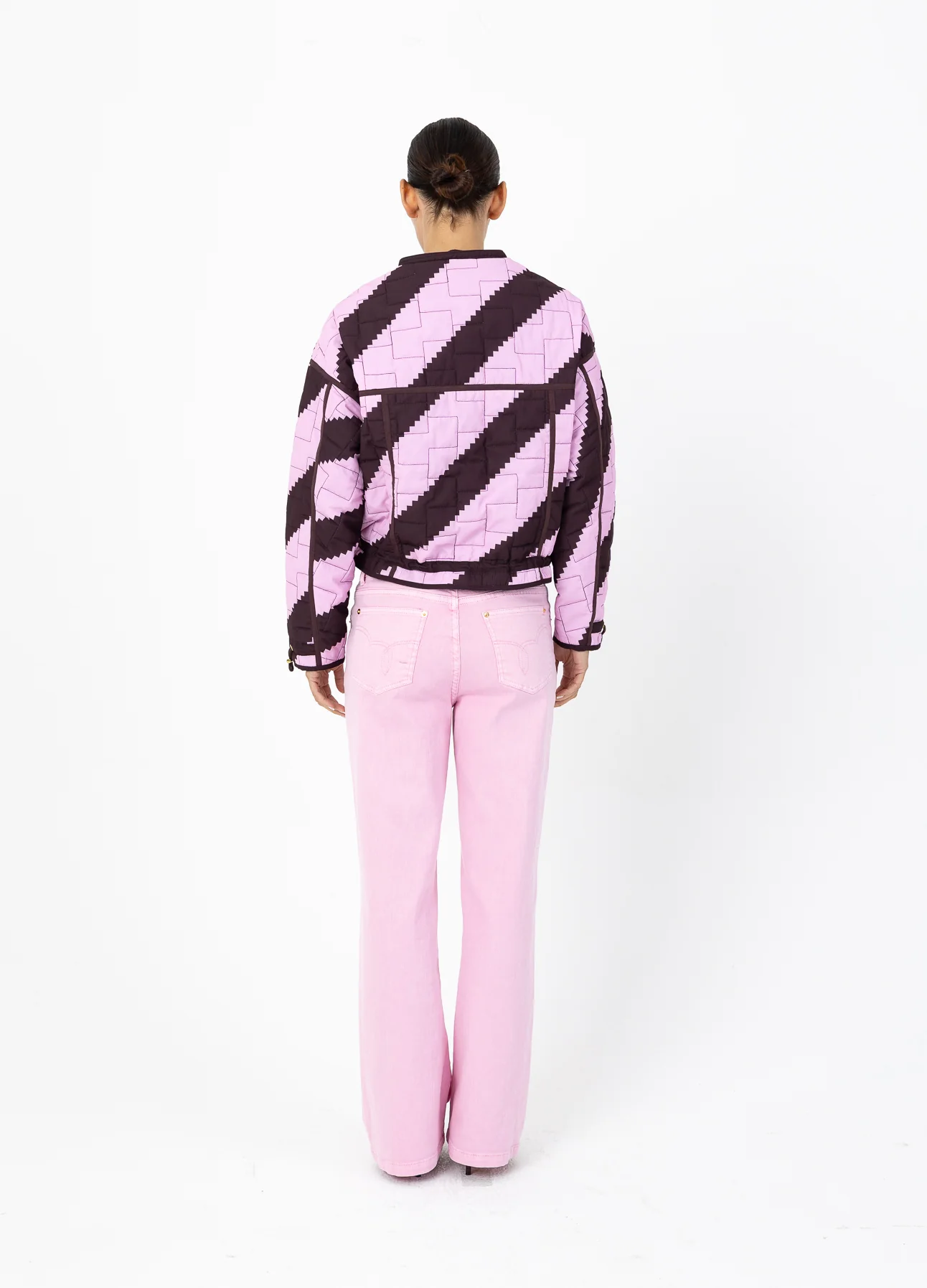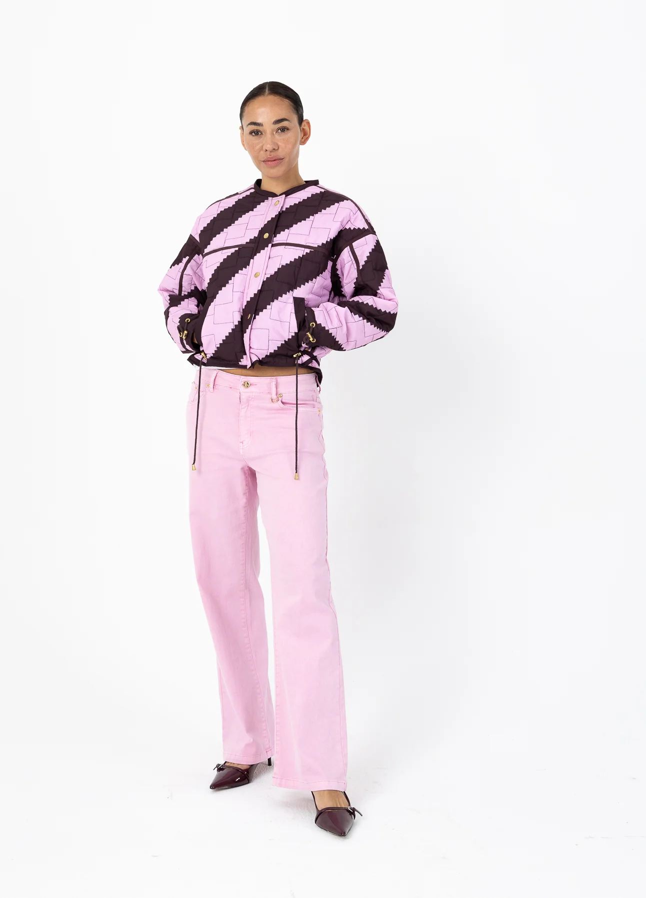 Het model is 173 cm lang en draagt maat S. Ze meet 84 cm rond de borst, 65 cm rond de taille en 96 cm rond de heupen.