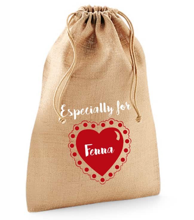 Jute zak met hart. Wilt u een extra tekst erop dan kunt u dit er extra bij vermelden (zoals voorbeeld Especially for)
