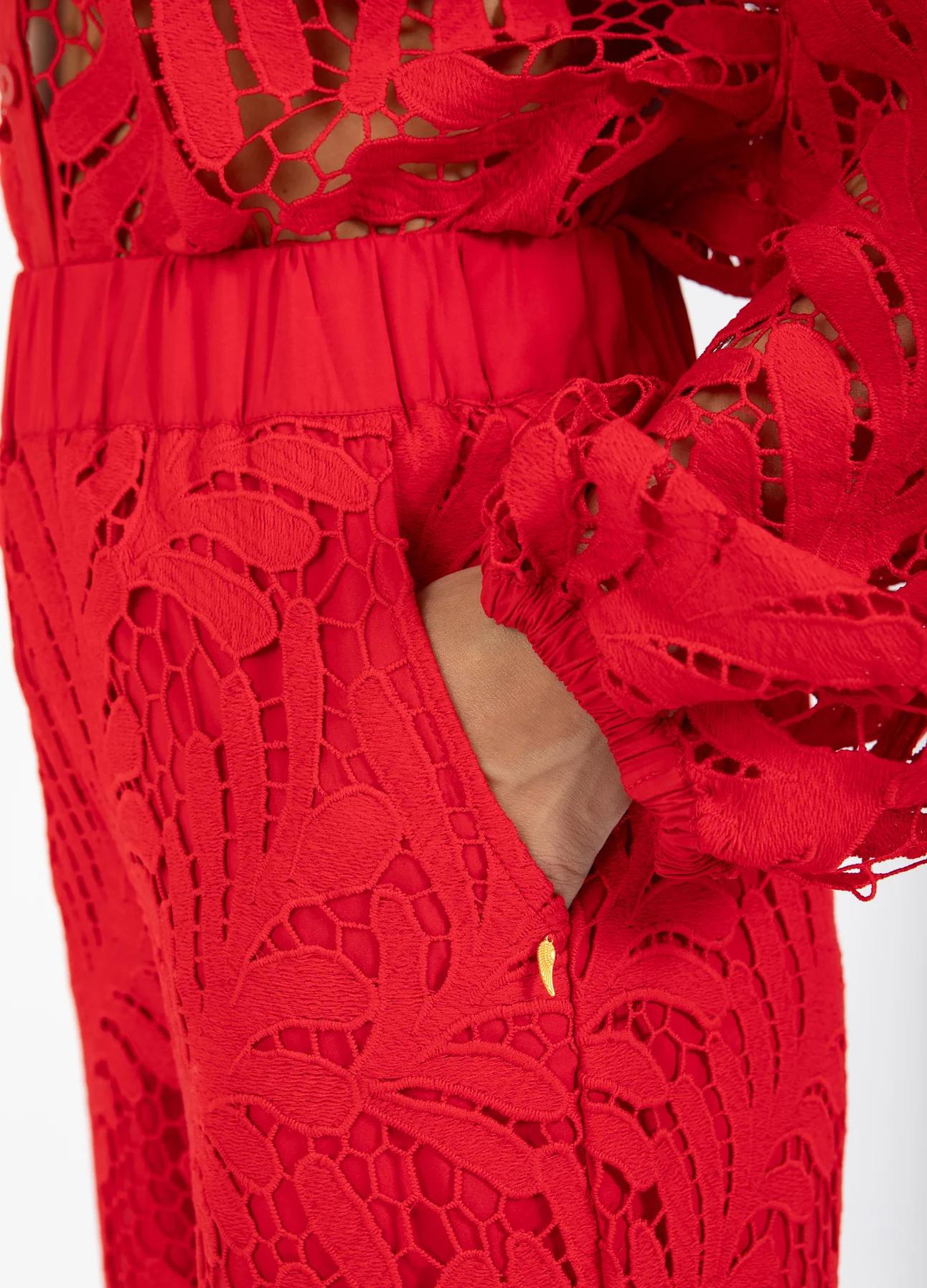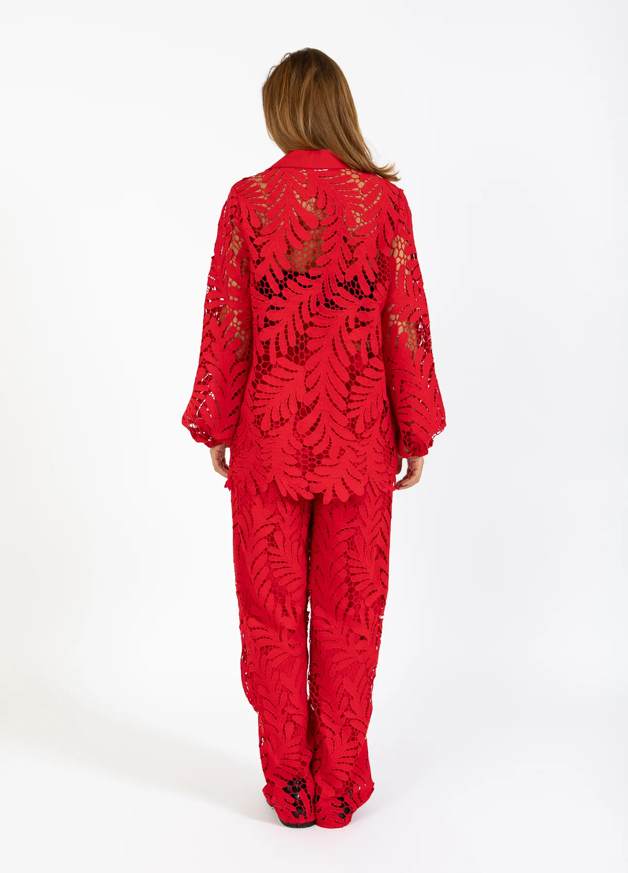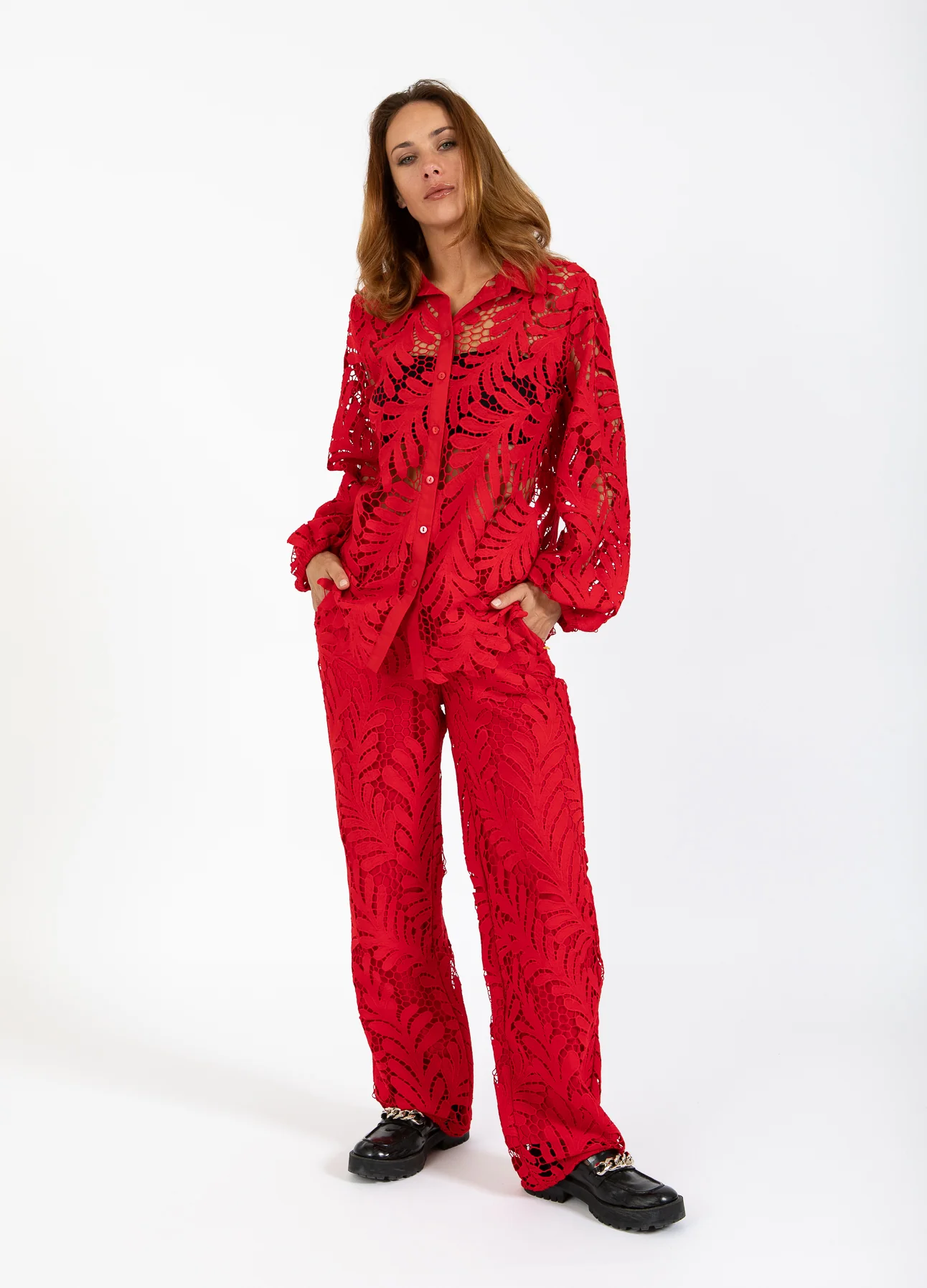 Deze opvallende kanten broek is ontworpen om een vleugje verfijning en elegantie toe te voegen aan elke garderobe. Perfect voor speciale gelegenheden of een avondje uit.