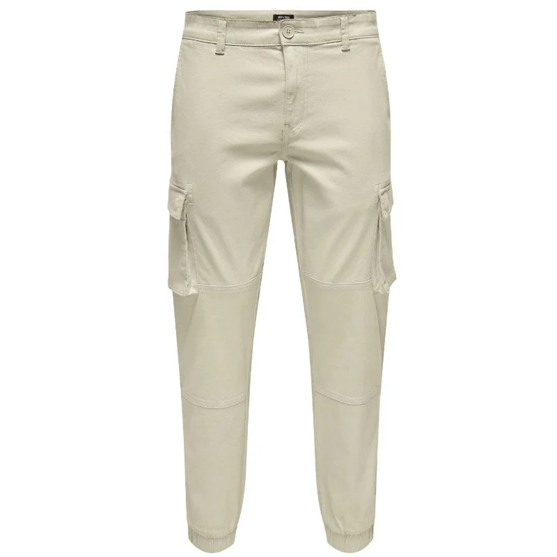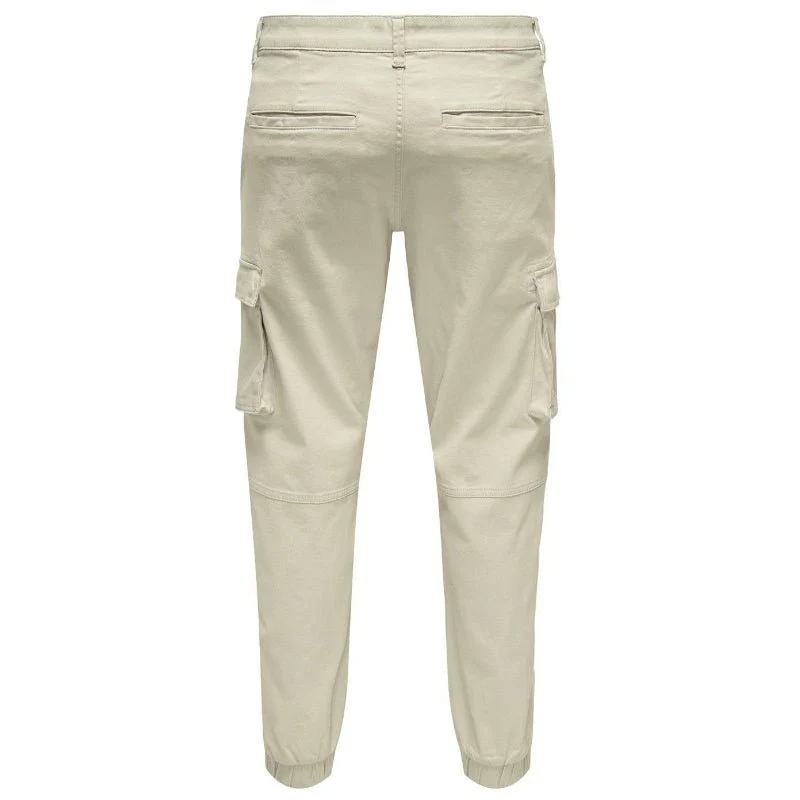Kit cargo broek Cam Stage van Only & Sons voor heren. Deze broek is voorzien van voor- en achterzakken. De broek heeft een kit kleur en cargozakken aan de zijkant van de broek. Te sluiten via een knoop- en ritssluiting en met elastieken boorden om de enkels en riemlussen. Gemaakt van 98% katoen en 2% elastan.
