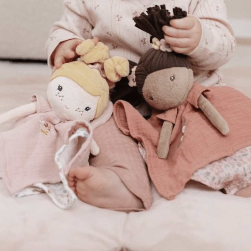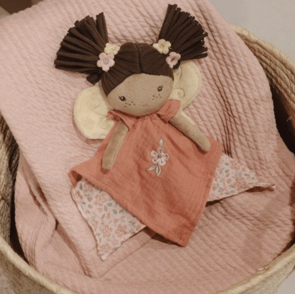 Laat je kleintje wegdromen in een wereld vol vrolijke bloemen met dit prachtige feeën knuffeldoekje. Haar zachte vleugels, geborduurde details, blonde haren en lichtroze jurkje maken haar perfect voor kleine handjes om vast te pakken en te knuffelen. Deze fee stimuleert de zintuigen en biedt comfort en geborgenheid. Ideaal voor dutjes of onderweg! Tip: zo’n uniek knuffeldoekje is ook een geweldig kraamcadeau.