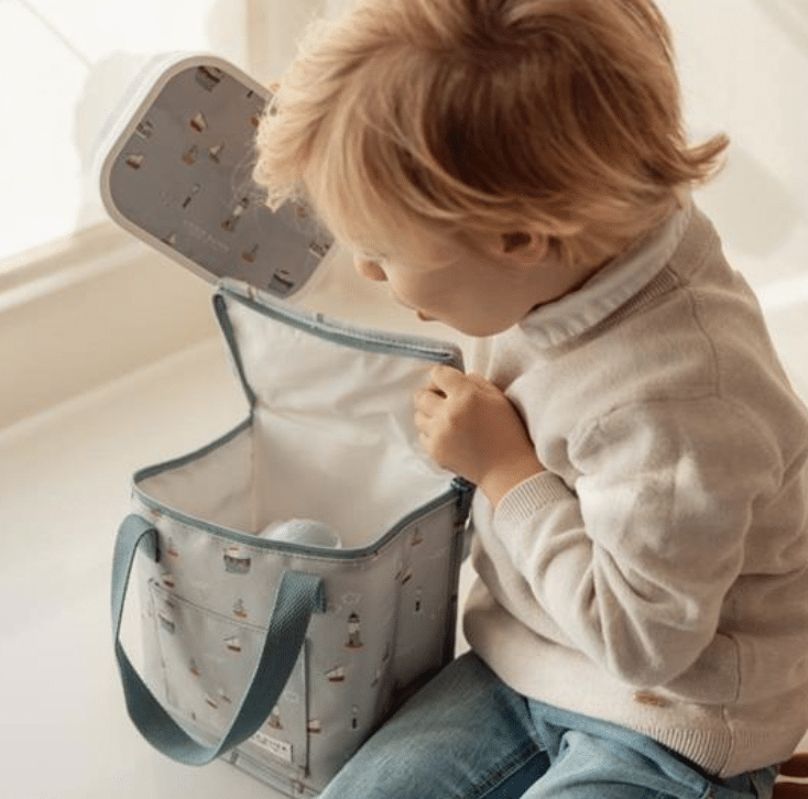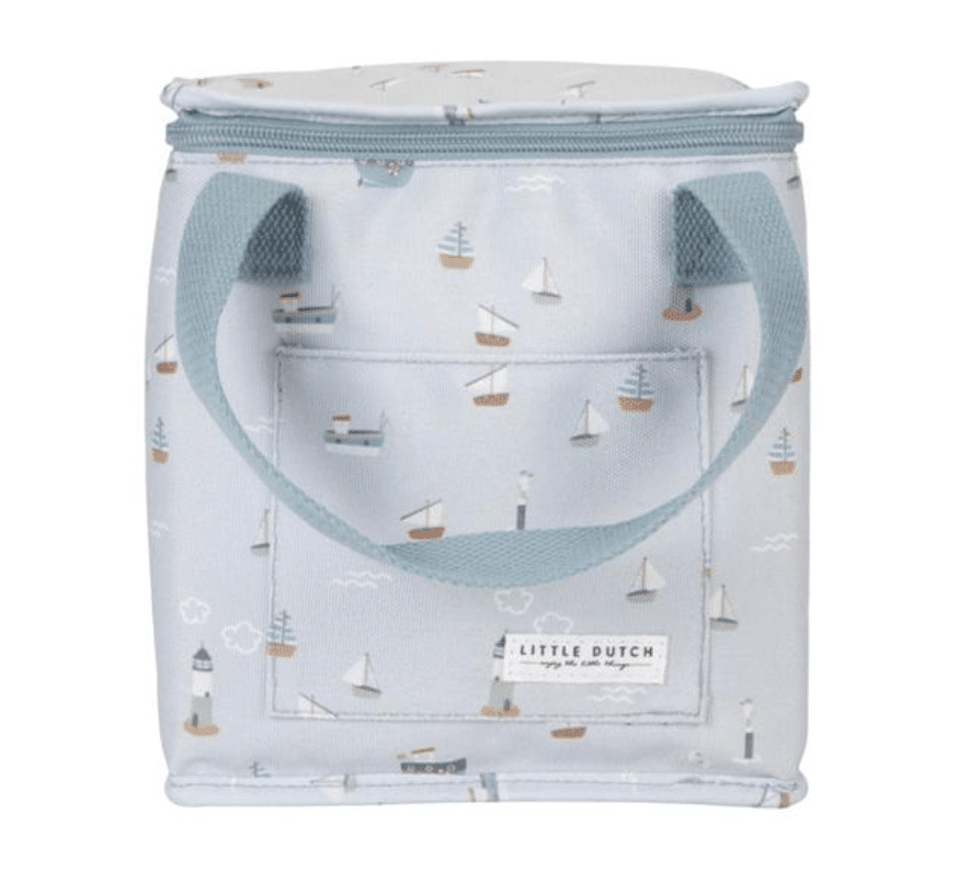 Dit leuke koeltasje Sailors Bay Blueis gemaakt van stevig canvas. De binnenkant is isolerend, waardoor hapjes en drankjes lekker koel blijven. Ideaal voor een lunch op school én voor onderweg! De koeltas is 21,5 x 20 x 12 cm. Genoeg ruimte voor een lunchbox, stuk fruit en een flesje of pakje drinken dus. In het vakje aan de voorkant kan je nog een koekje kwijt en met de hengsels neemt je kindje de koeltas gemakkelijk mee.