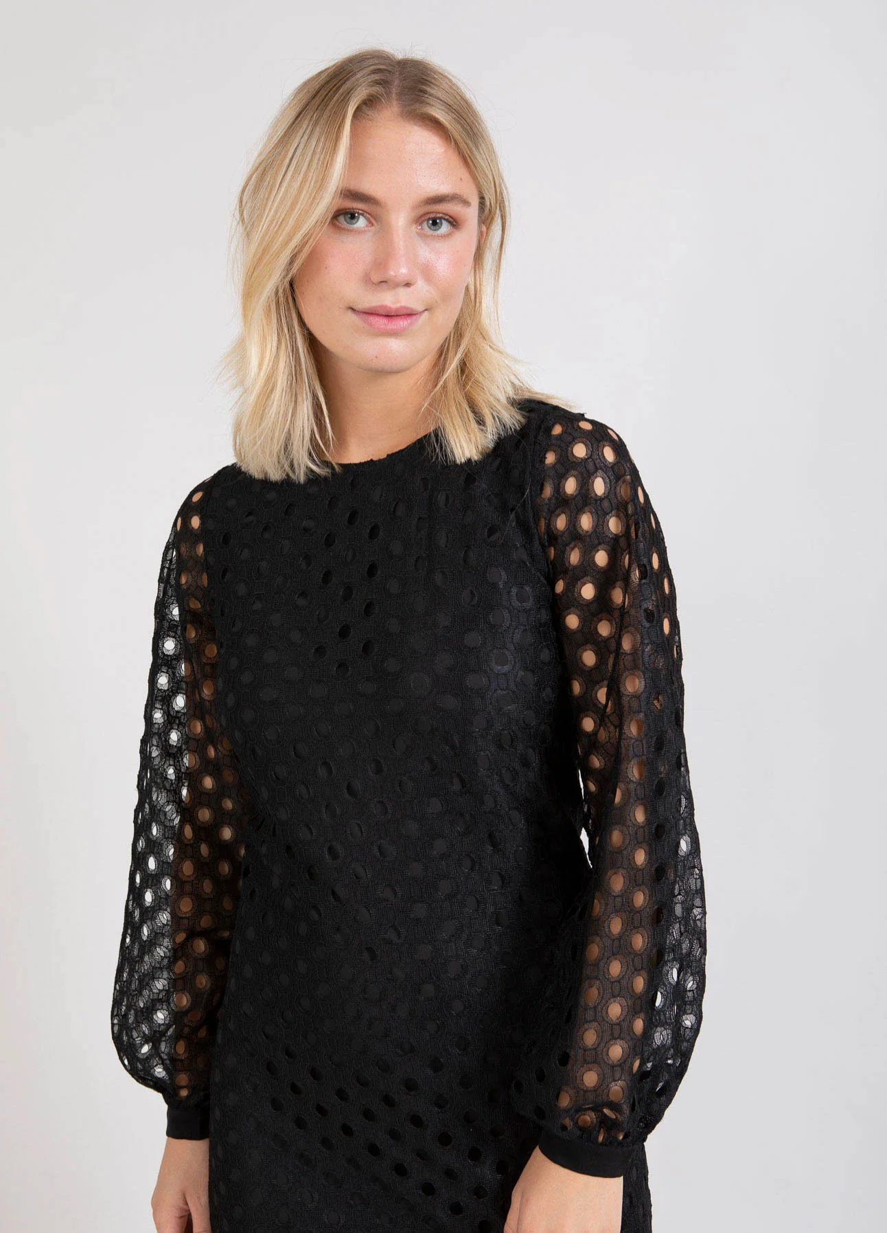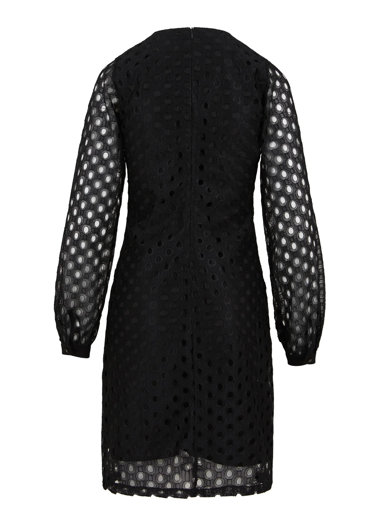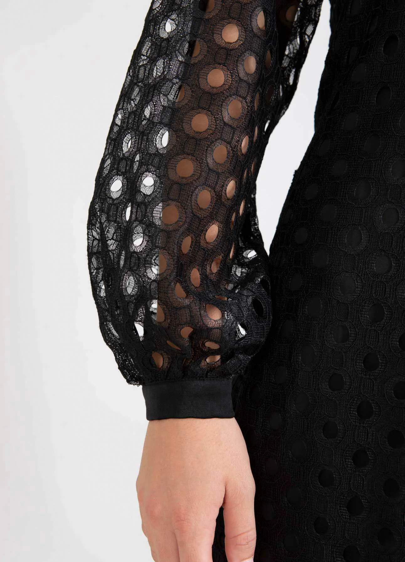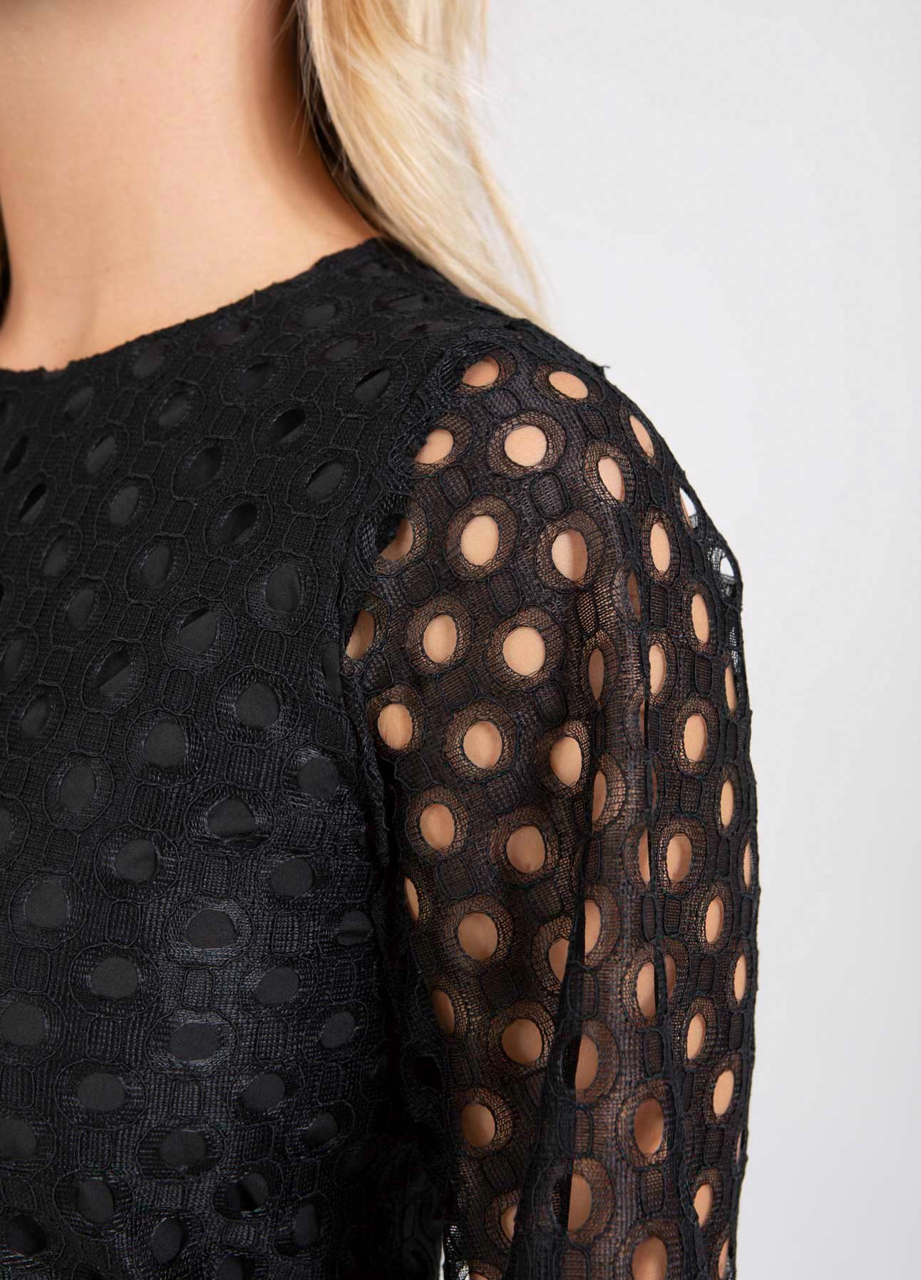 Korte jurk in een fijne cirkelkant. Het lichaam van de jurk is gevoerd, maar de mouwen zijn deels doorschijnend. De jurk is getailleerd zodat hij mooi op het lichaam zit.