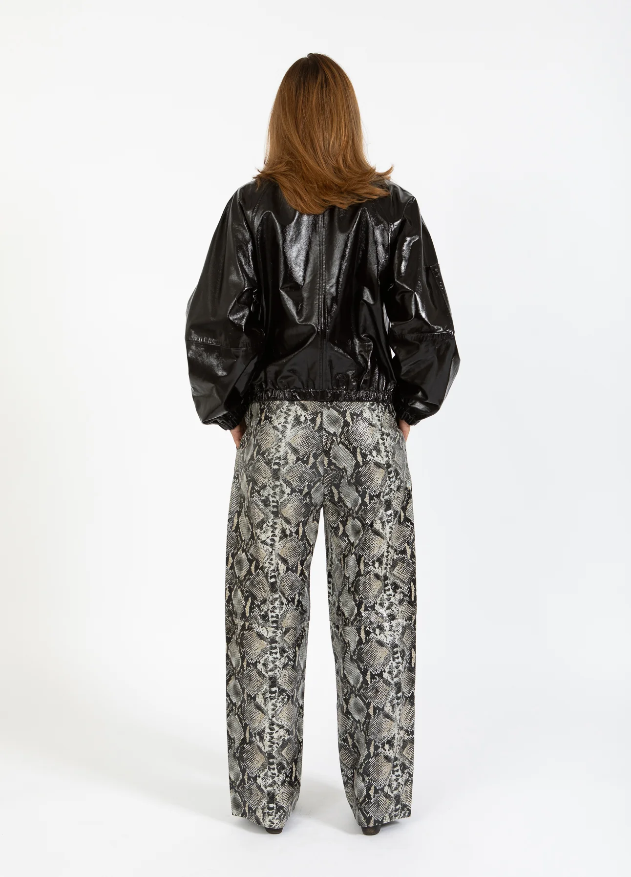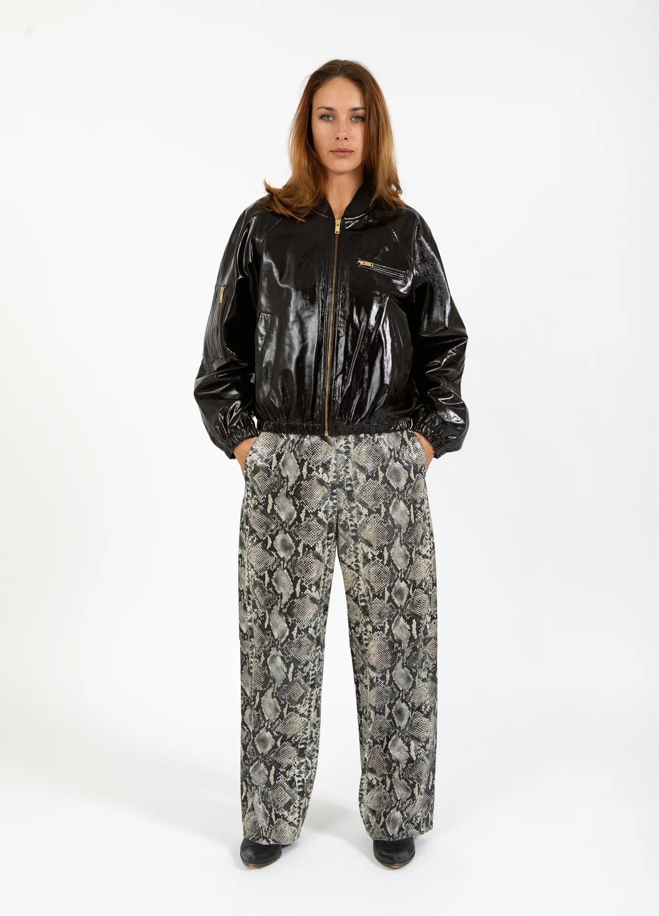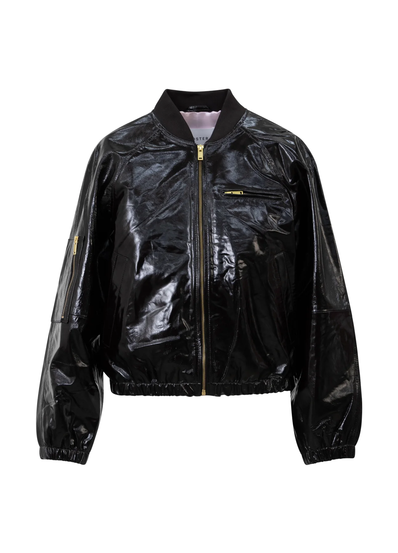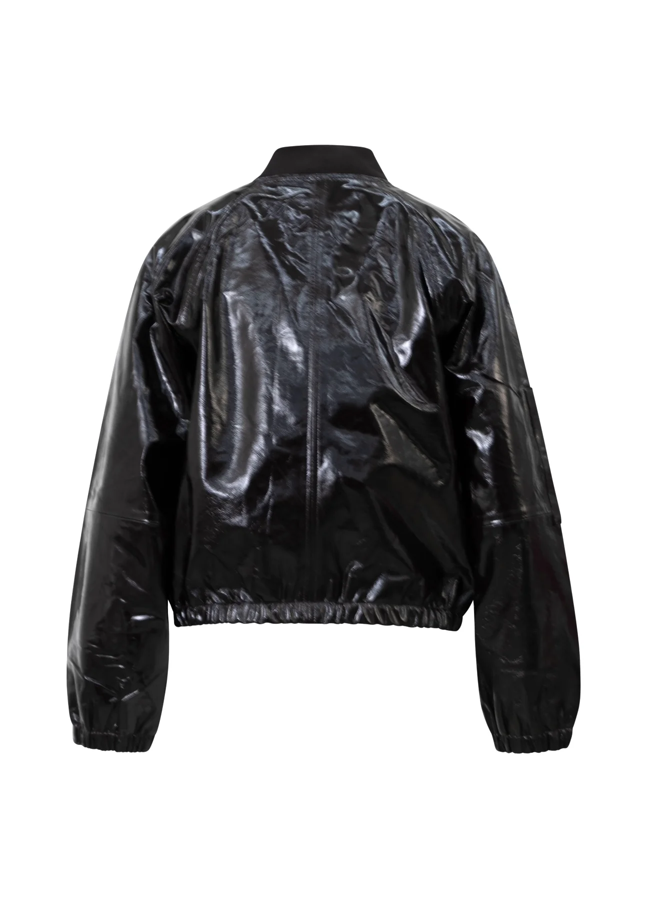 Deze chique leren bomberjack voegt een urban tintje toe aan elke outfit. Het glanzende leer en de fijne details, zoals gouden ritsen, geven een luxueuze touch.
