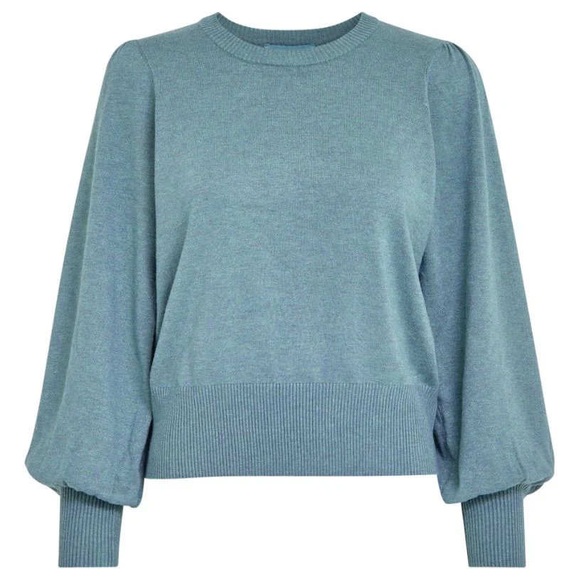Lichtblauwe pullover Liva van Minus voor dames. Deze trui is voorzien van een ronde hals en lange mouwen met elastische boorden. De trui heeft een lichtblauwe kleur en wijdere mouwen als extra detail. Gemaakt van 82% viscose en 18% elastan. De trui is leuk om te combineren met een jeans of pantalon.