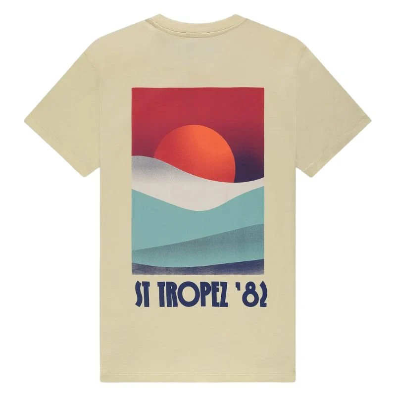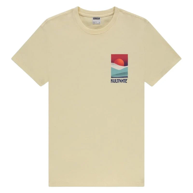 Lichtgeel t-shirt Tropez van Kultivate voor heren. Dit regularfit t-shirt is gemaakt van 100% biologisch katoen en heeft een gave en opvallende rugprint met een subtielere versie op de borst. Dankzij de korte mouwen, ronde geribde hals en rechte zoom is dit zomerse shirt een perfecte combinatie van stijl en comfort voor elke dag.