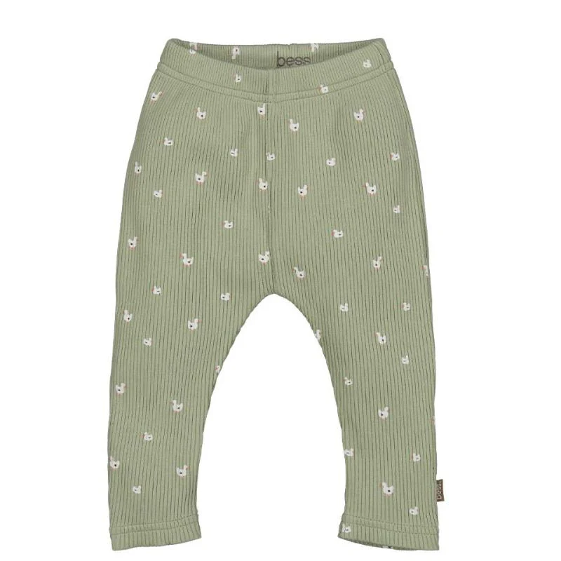 Lichtgroen geprinte legging Goose van Bess voor baby meisjes. Deze lieve legging van BESS is een echte musthave voor elke baby garderobe. De zachte ribstof met subtiele gansjesprint zorgt voor een schattige en frisse uitstraling, perfect voor de allerkleinsten. Dankzij de elastische tailleband zit de legging comfortabel en blijft hij goed op zijn plek, ook tijdens het spelen of kruipen. De lichtgroene kleur is zacht en neutraal, waardoor dit broekje makkelijk te combineren is met andere items uit de collectie.