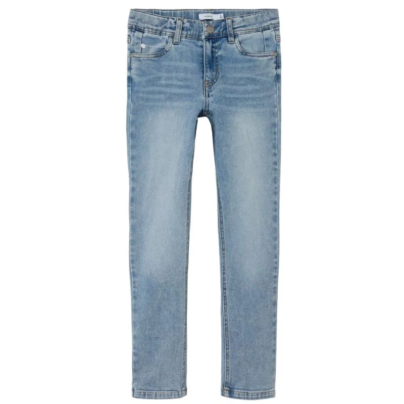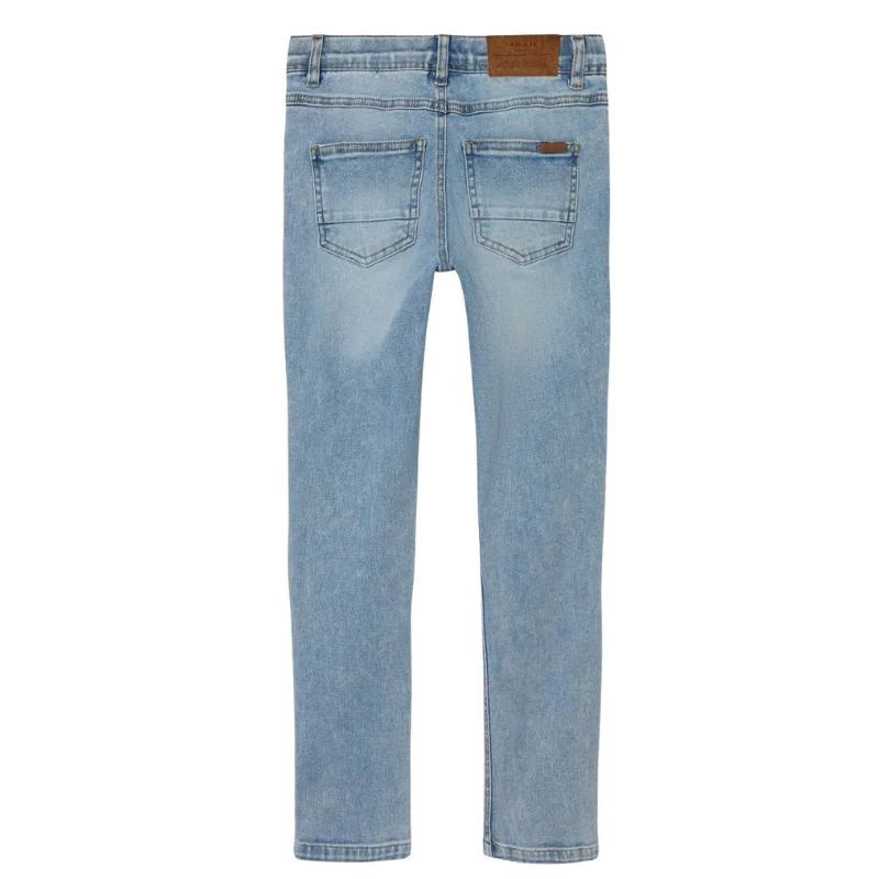 Light Blue Denim jeans Theo Gy van Name It voor jongens. Deze jeans is voorzien van een knoop- met ritssluiting, voor- en achterzakken, riemlussen en broekzakken. De jeans heeft een blauwe kleur. Gemaakt van 68% katoen, 27% polyester, 3% viscose en 2% elastan. De jeans heeft een slim fit en verstelbaar elastiek voor de perfecte pasvorm.