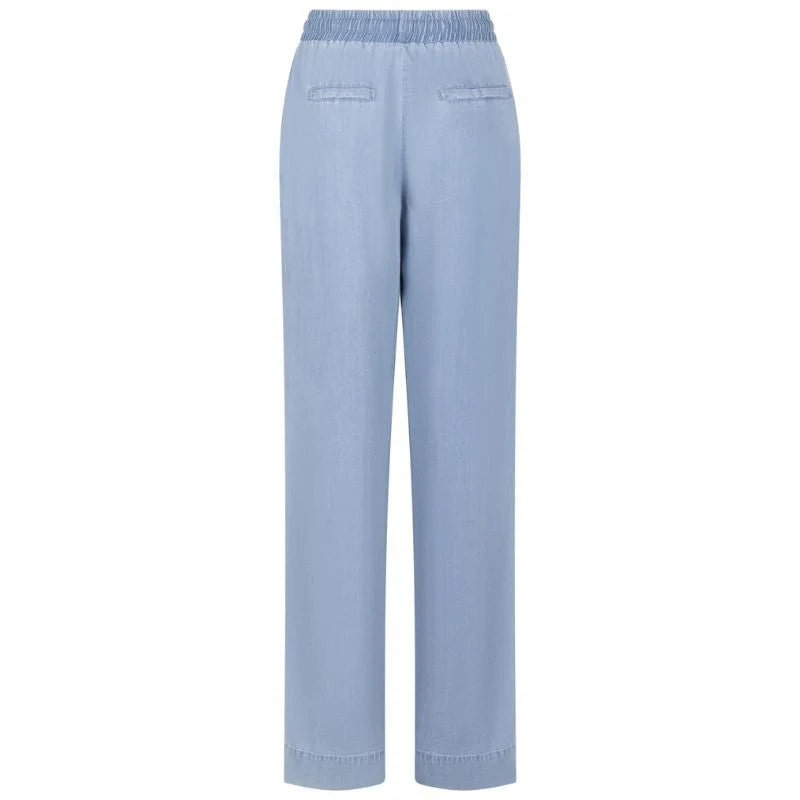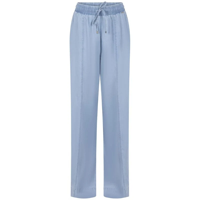 Light Denim tencel chambray broek Farah van ZOSO voor dames. Deze broek heeft een frisse en moderne uitstraling dankzij de zachte lichtblauwe denimkleur en de soepel vallende pijpen. De elastische tailleband met strikkoord zorgt voor extra comfort en geeft het model een relaxte en vrouwelijke look. De rechte pijpen vallen losjes langs het been en creëren een luchtig silhouet dat perfect past bij het seizoen.