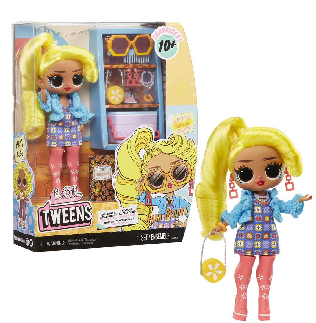 Ontdek de gloednieuwe L.O.L. Surprise Tweens-modepop Hana Groove, een fan van langspeelplatenwinkels en alles wat retro is! Pak 10+ verrassingen uit en maak kennis met Hana Groove. Ze vindt het geweldig om haar verzameling langspeelplaten uit te breiden en staat altijd klaar om te grooven. Ze is het middelpunt van elk feest en nodigt haar BFF’s graag uit samen iets leuks te doen, vooral op zonnige dagen! Trek Hana Groove haar supermooie, op de jaren zeventig geïnspireerde mode aan, zoals een stijlvolle gehaakte jurk en roze laarzen tot over de knie die perfect zijn om te stappen. Aan haar tasje met bloemenprint en trendy zonnebril kun je zien dat ze van zonnige retrodagen houdt! Haar outfit omvat ook een kort jack met ruches, vierkante oorbellen, een schattige armband en een coole halsketting met een dubbele rij kralen! Bovendien heeft ze een schattige koelbox bij zich, het beste accessoire voor een picknick of danceparty, plus een snoezige polaroidcamera om elk moment mee vast te leggen.