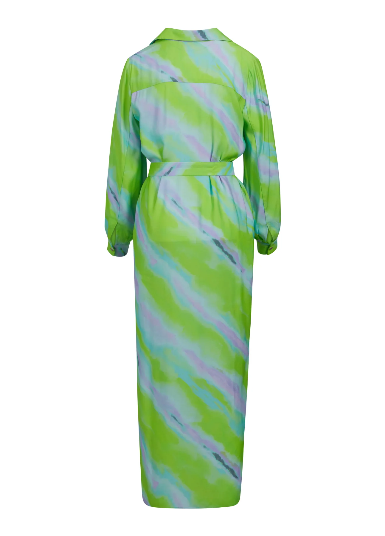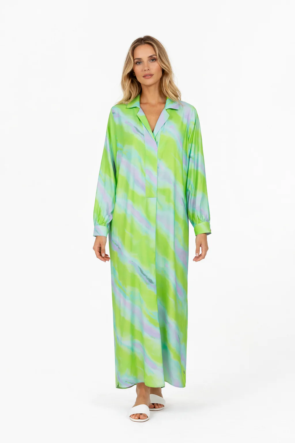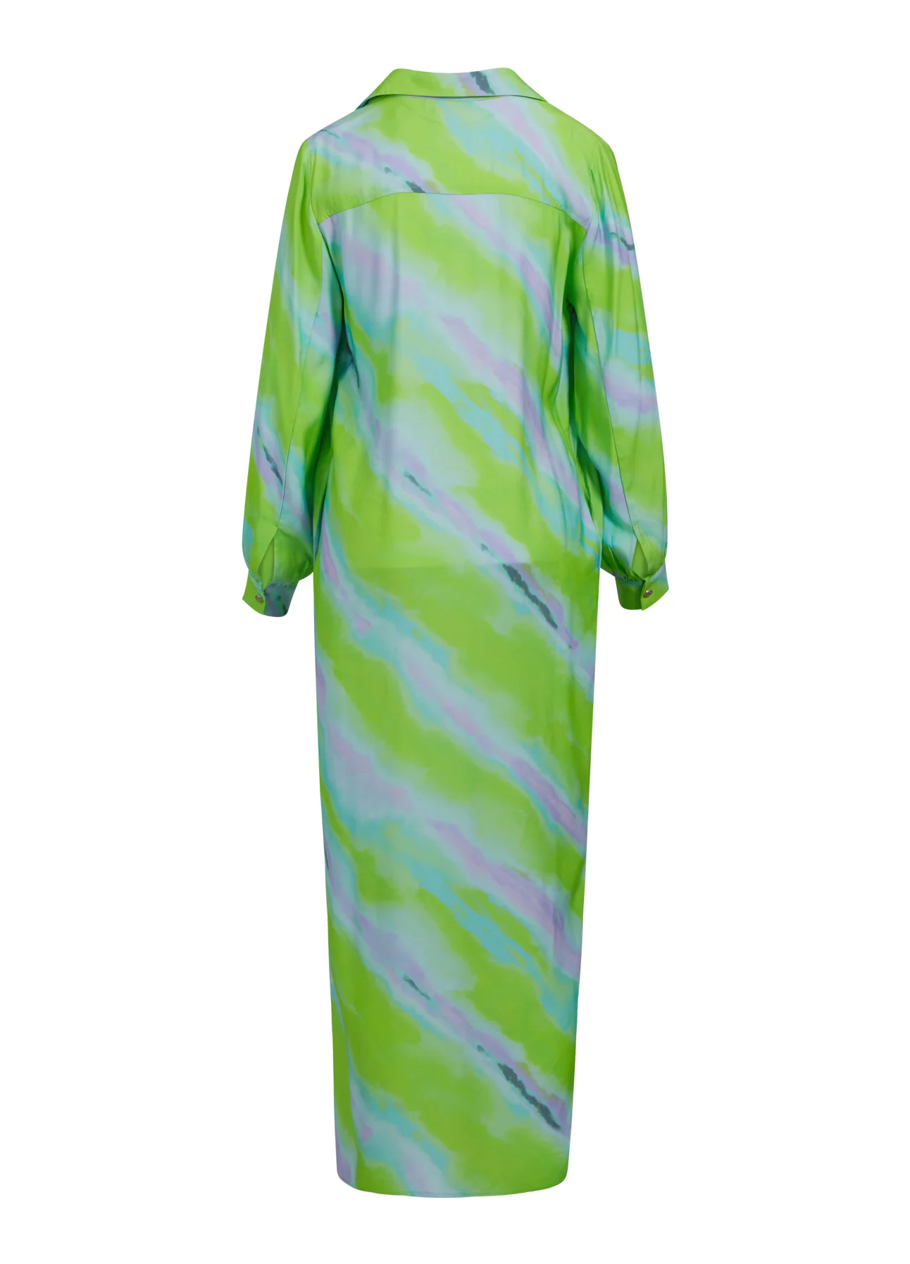 Lange jurk m. vervaagde strepenprint, open kraag en losse pasvorm.