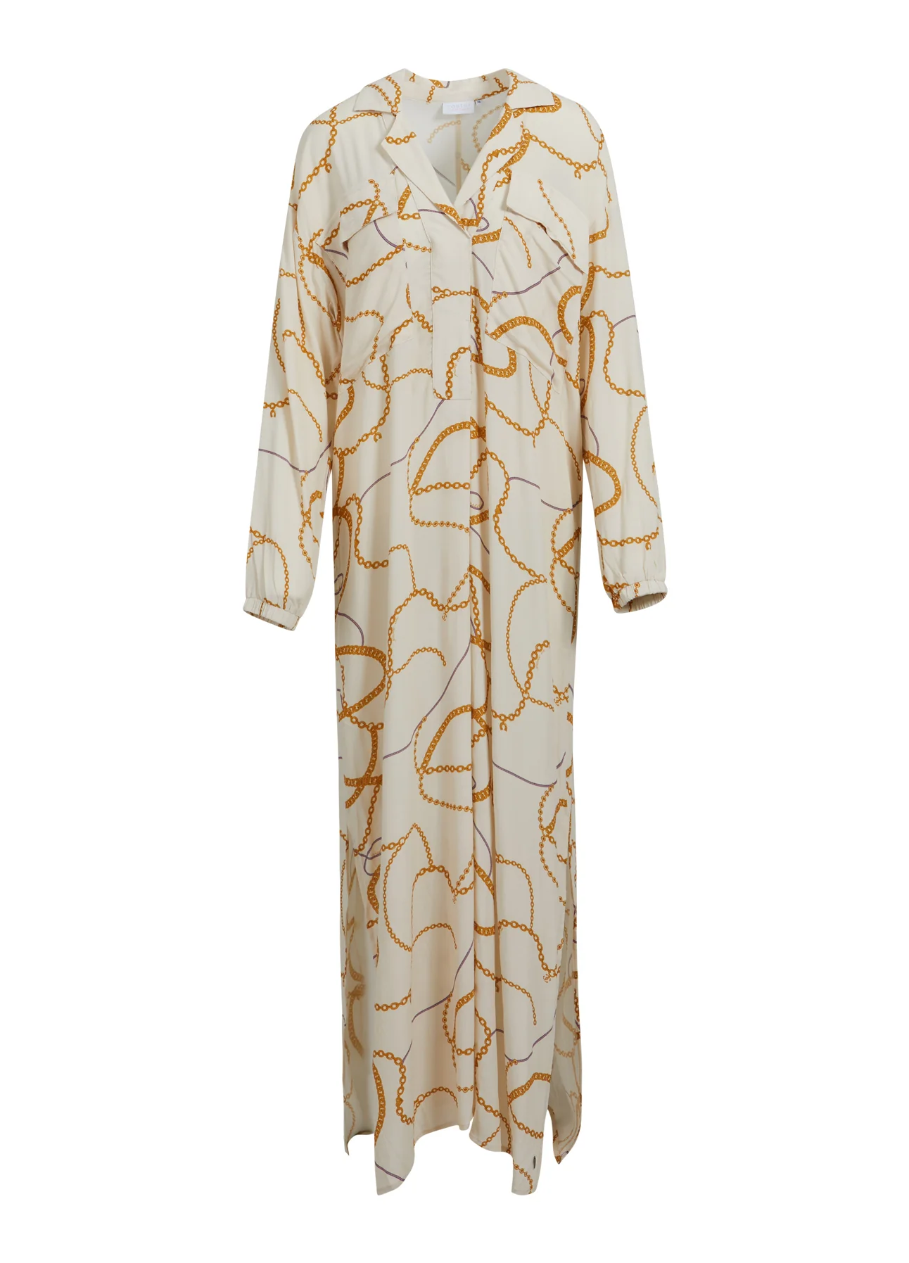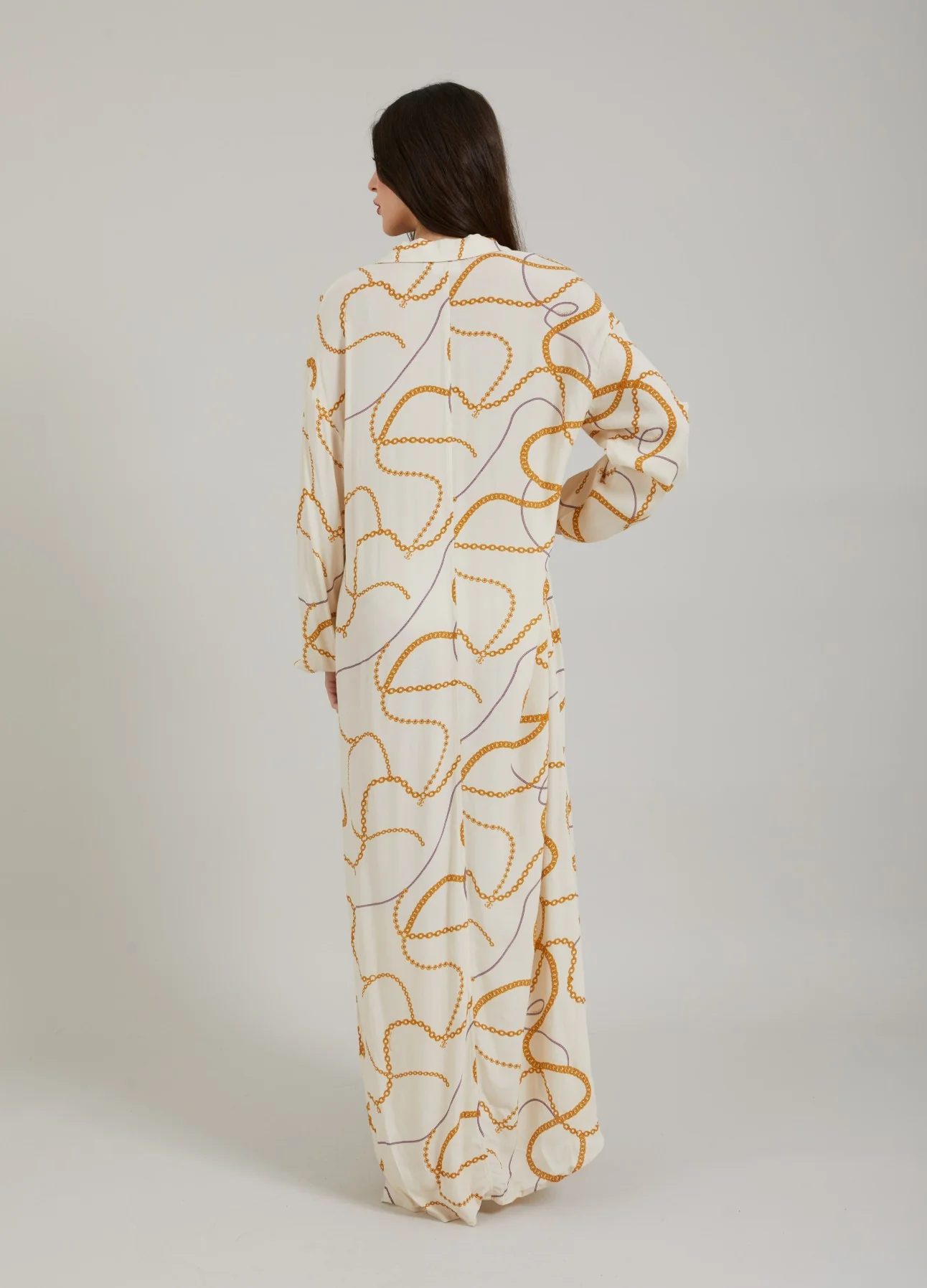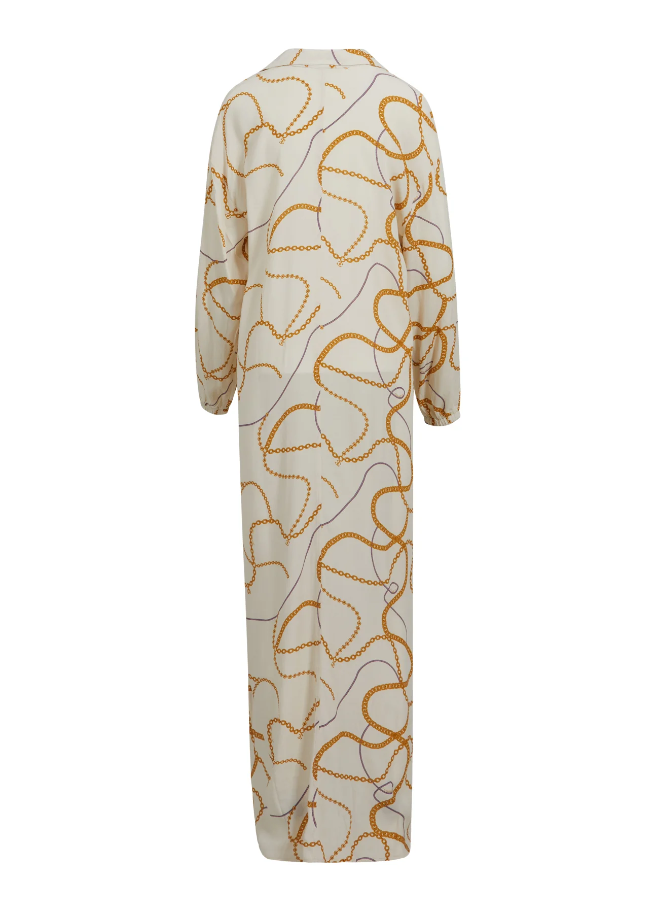 Lange overhemdjurk met chain print, open kraag en losse pasvorm.