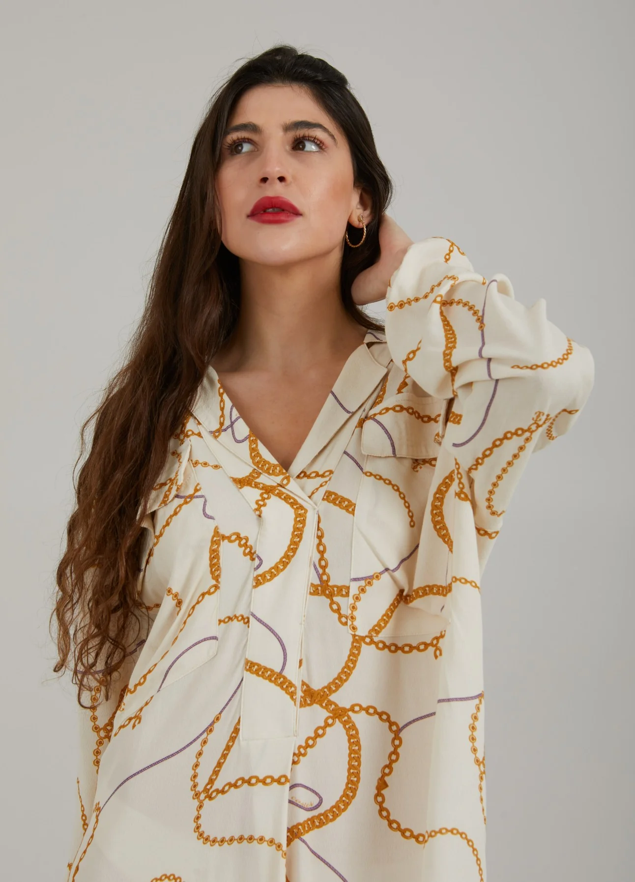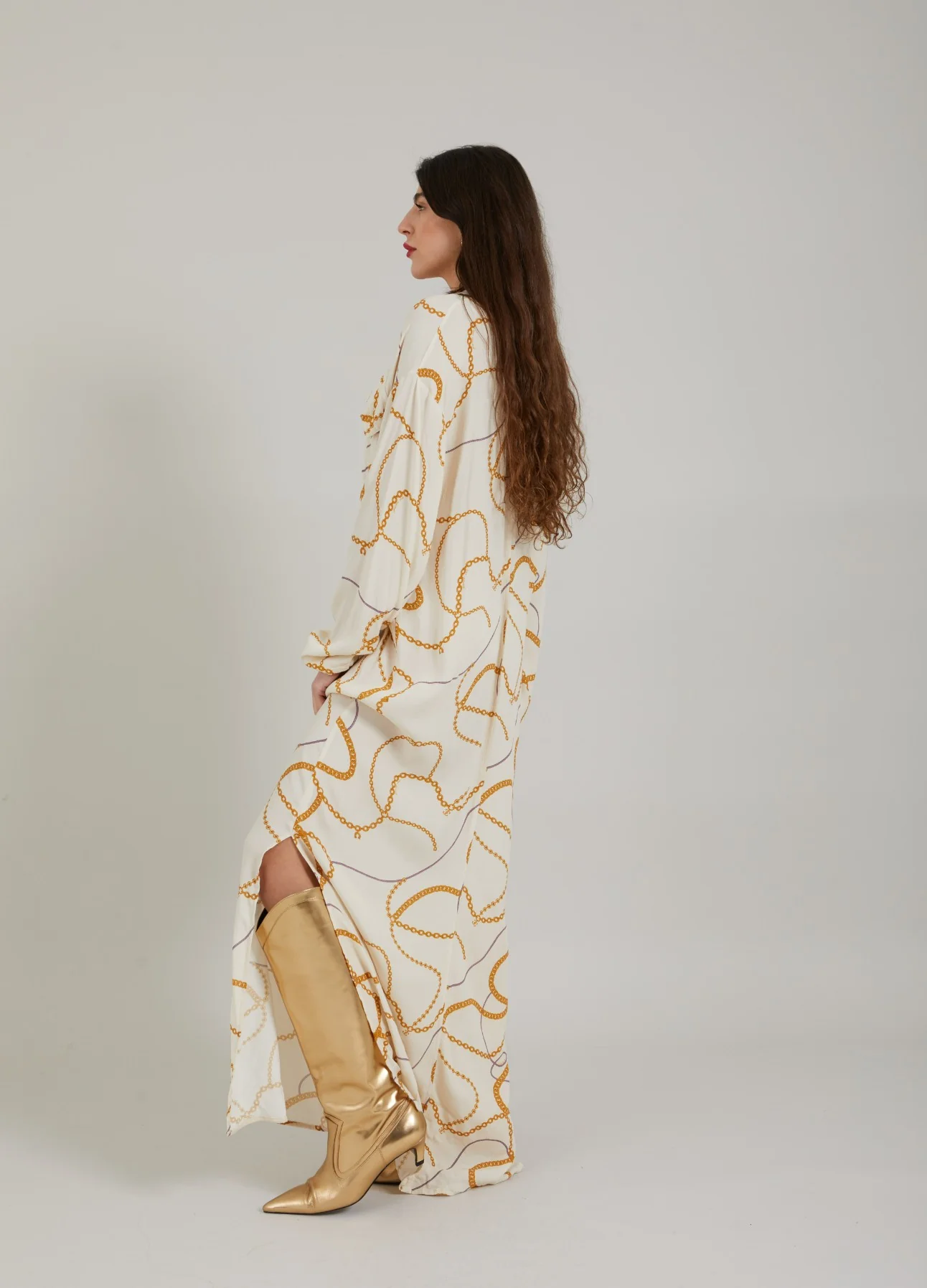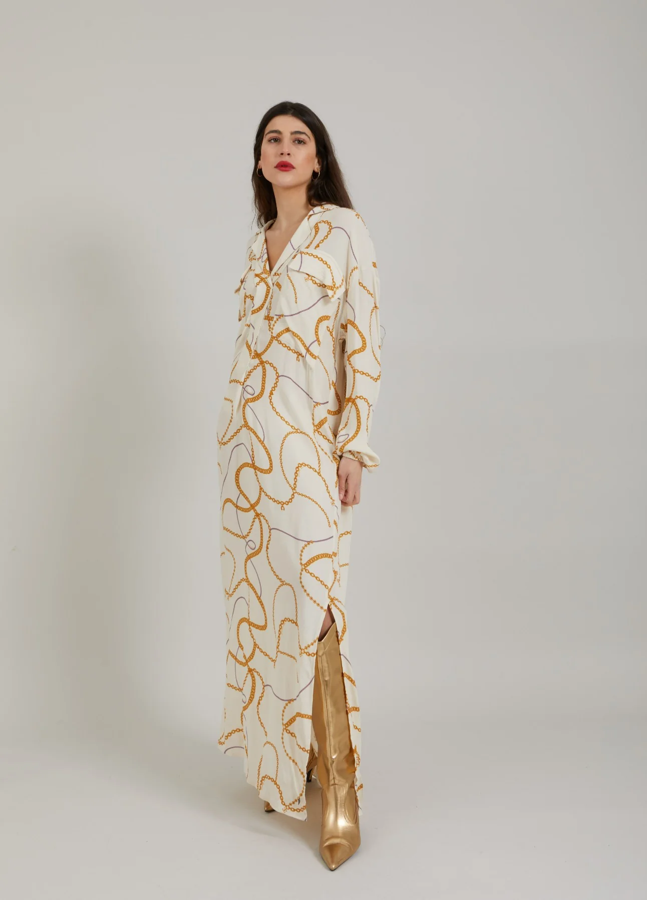 Lange overhemdjurk met chain print, open kraag en losse pasvorm.