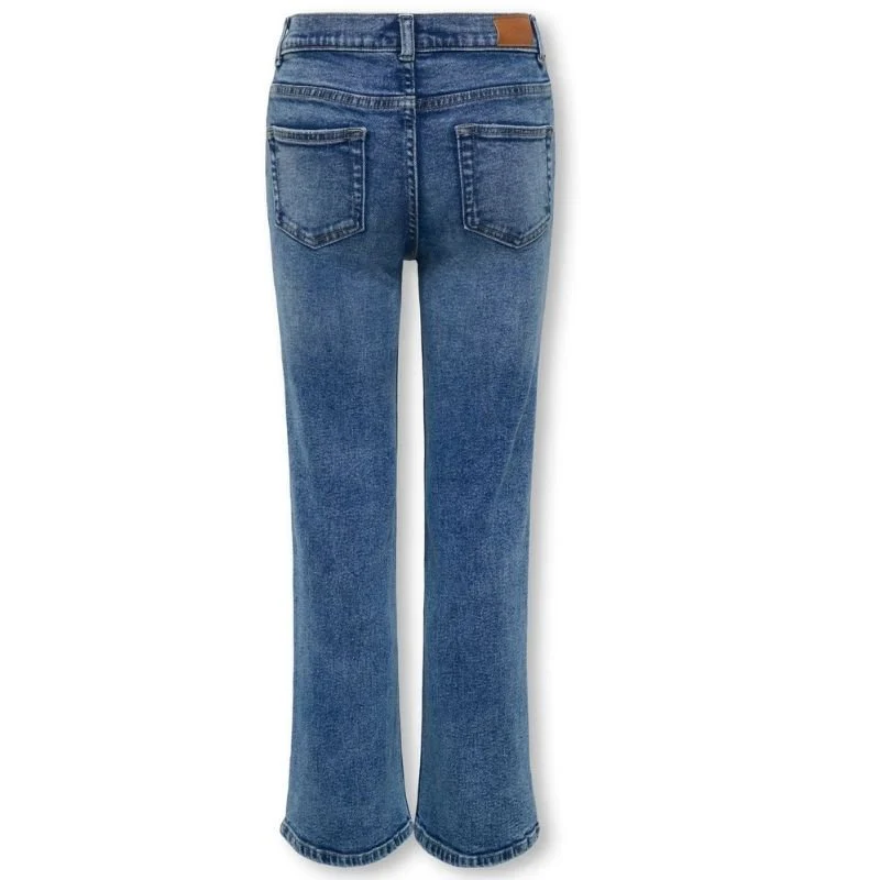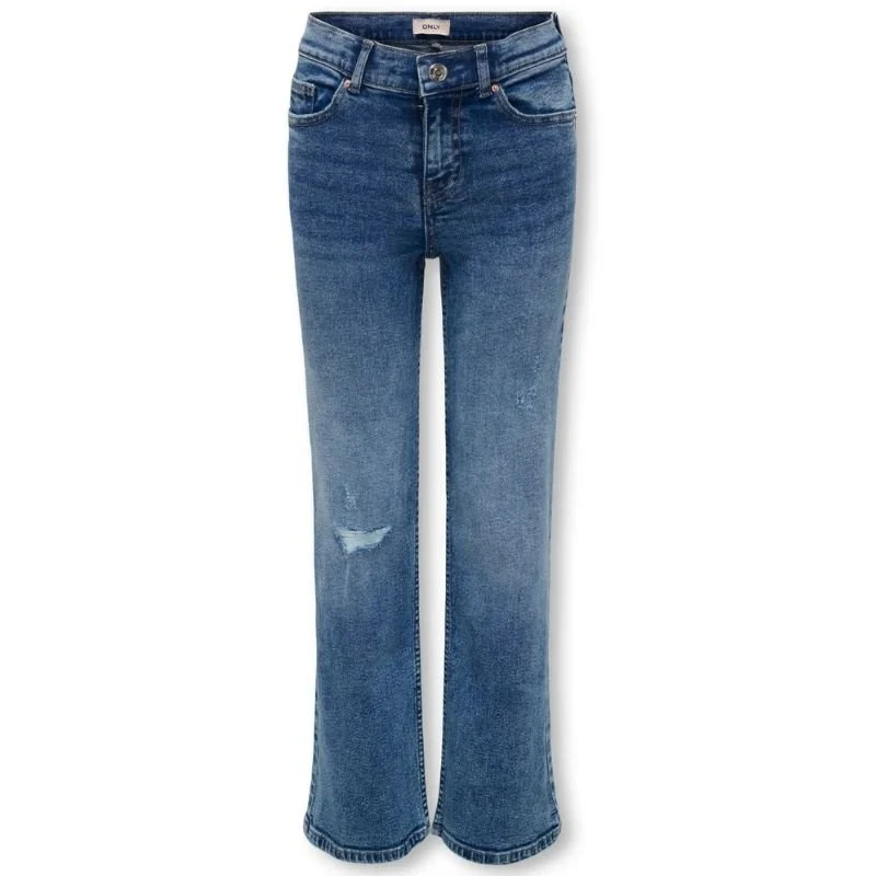 Medium Blue Denim wide jeans Juicy Damaged van ONLY voor meiden. Deze variant van de populaire Juicy jeans heeft een extra stoere twist dankzij de subtiele damaged details. De lichte slijtageplekken geven de broek een coole, gedragen look, zonder in te leveren op stijl of comfort. De mediumblauwe wassing zorgt ervoor dat de jeans makkelijk te combineren is met allerlei kleuren en stijlen – van casual tot trendy.