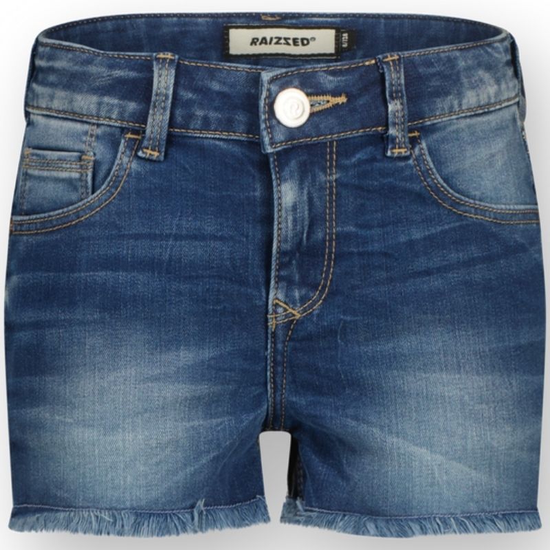 Mid Blue Stone short Louisiana van Raizzed voor meisjes. Deze trendy spijkershort is een absolute must-have voor zomerse dagen! Met een stijlvolle donkerblauwe wassing en een speels, afgeknipt zoompje straalt hij een casual en trendy vibe uit. De short is voorzien van handige riemlussen, zodat je hem perfect kunt stylen met je favoriete riem. Comfortabel, veelzijdig en perfect voor elke zomerse look!