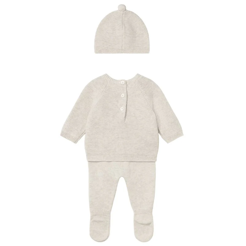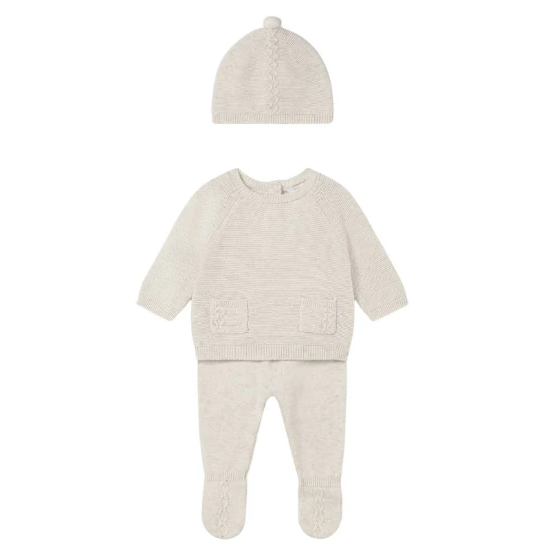 De trui heeft raglanmouwen en een comfortabele pasvorm die voldoende bewegingsvrijheid biedt. Aan de achterkant zorgen knoopjes ervoor dat het aan- en uittrekken eenvoudig gaat, ideaal voor drukke ochtenden. De gebreide structuur met gevlochten details geeft de set een klassieke en verfijnde look, terwijl de functionele zakjes aan de voorkant zorgen voor een charmant accent.