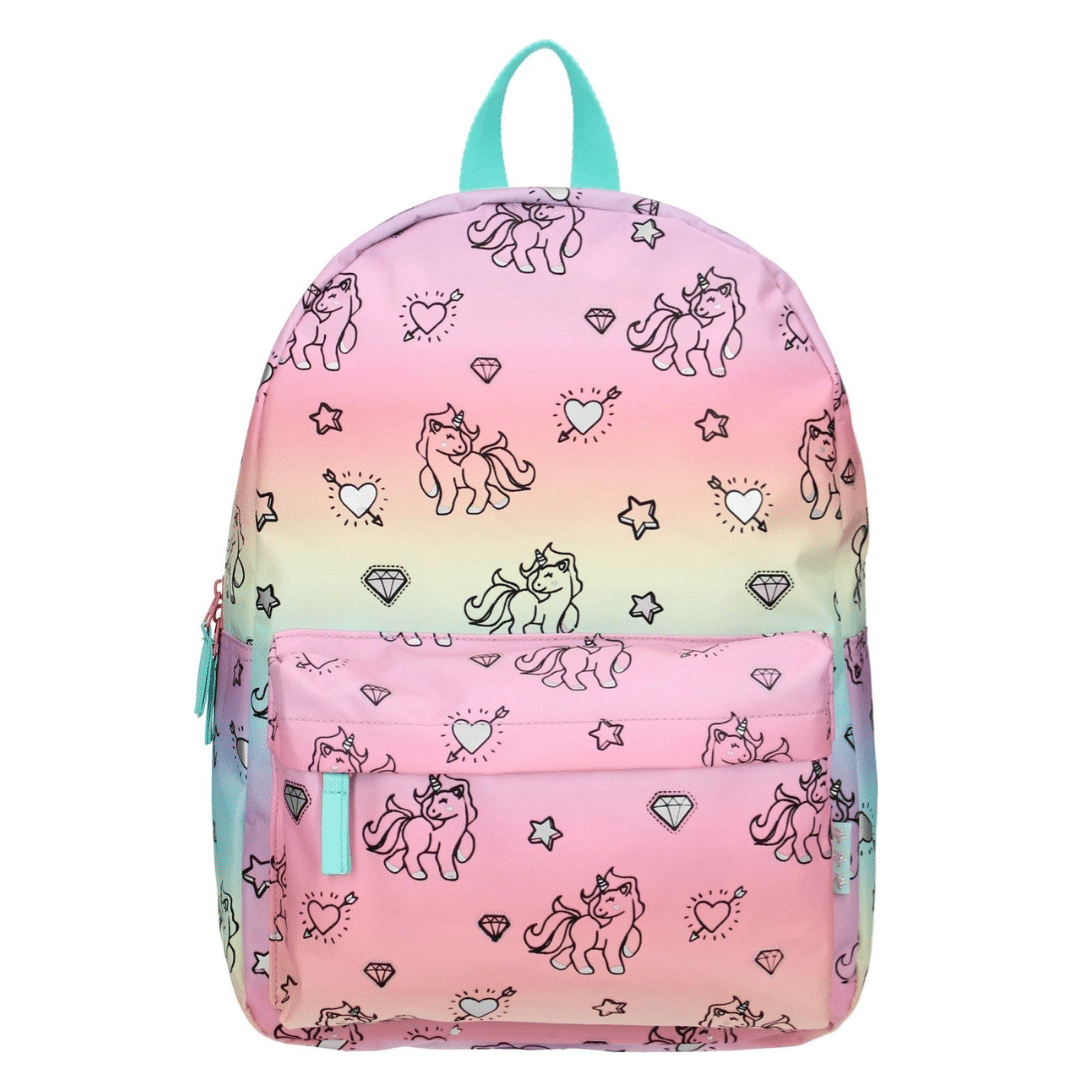 Waar worden kleine meisjes gelukkig van? Rainbows en Unicorns! De Milky Kiss Rainbows and Unicorns collectie is dan ook een prachtige must-have collectie voor kleine unicorn fans in regenboog/pastelkleuren. De rugzak heeft een ruim hoofdvak en is met rits af te sluiten, net als het kleine opbergvakje aan de voorzijde. Het rugpand is verstevigd en de schouderbanden gewatteerd en in lengte verstelbaar. De rugzak is ook te dragen aan de lus aan de bovenzijde.