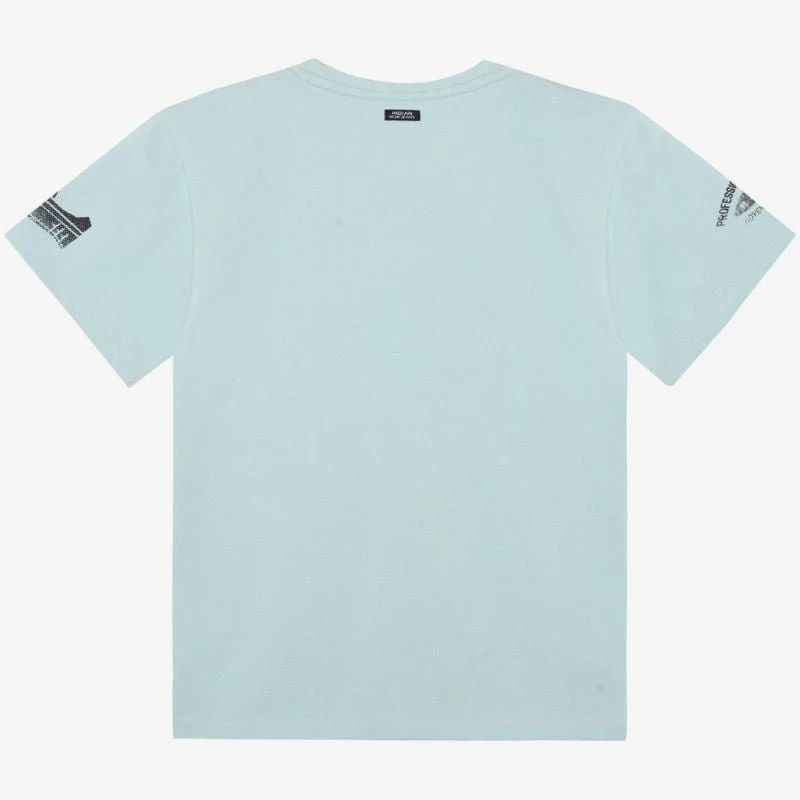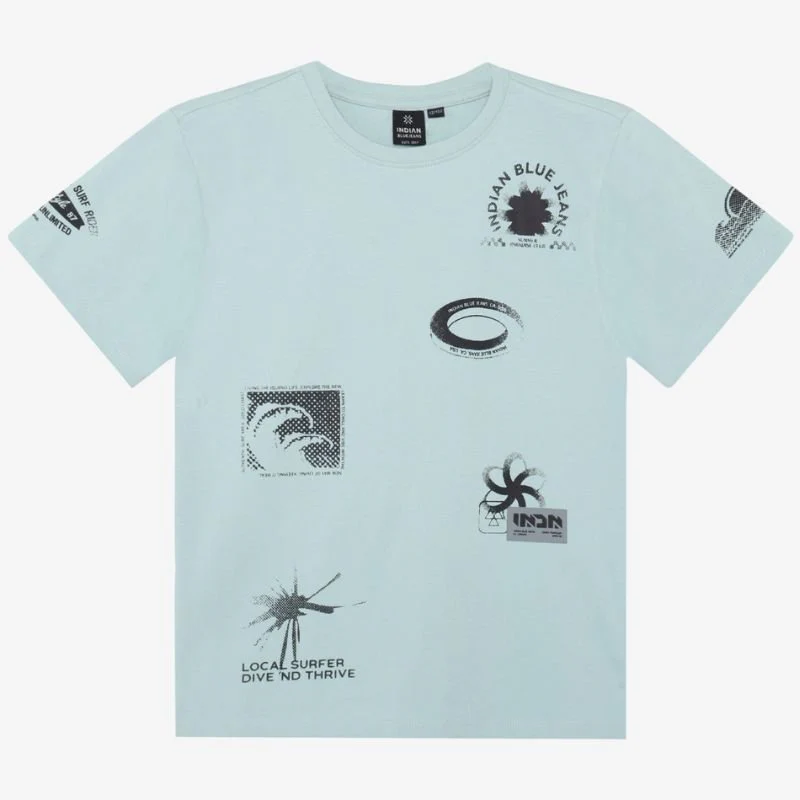 Mintgroen allover geprint t-shirt 960653 van Indian Blue Jeans voor jongens. Dit frisse mintgroene t-shirt is een echte eyecatcher binnen de zomercollectie en perfect voor jongens die houden van een stoere, opvallende look. De allover print met verschillende surf geïnspireerde badges, logo’s en graphics geeft het shirt een speelse en creatieve uitstraling. De zachte kleur in combinatie met de donkere prints zorgt voor een krachtig contrast dat meteen opvalt.