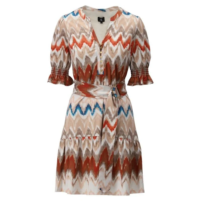 Multicolor geprinte jurk A122 van K-Design voor dames. Dit zomerse jurkje in zachte tinten heeft een speelse korte mouw met raffels en elastiek, én een ceintuur om je taille mooi te accentueren. Dankzij de StayFresh-coating blijft de jurk langer fris, wat minder wassen betekent. Duurzaam, comfortabel en perfect voor elke zonnige dag.