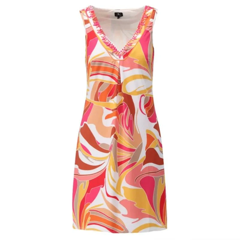 Multicolor geprinte v-hals jurk A300 van K-Design voor dames. Zomerse jurk in roze en oranje tinten, in een korter model dat perfect is voor de zomer. Dankzij de StayFresh-coating blijft de jurk fris en comfortabel, en je hoeft minder vaak te wassen. Minder slijtage, meer comfort – ideaal voor jou én het milieu!