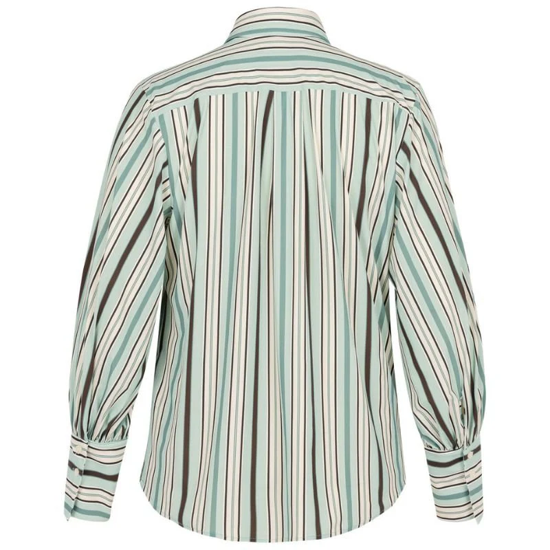 De blouse is uitgevoerd in een comfortabele regular fit die soepel langs het lichaam valt en voldoende bewegingsvrijheid biedt. De knopenlijst middenvoor zorgt voor een tijdloze uitstraling, terwijl de lange mouwen zijn afgewerkt met brede manchetten voor een krachtige en vrouwelijke touch. Het streepdessin combineert warme en frisse tinten, waardoor de blouse moeiteloos past binnen zowel een zakelijke als een casual garderobe.