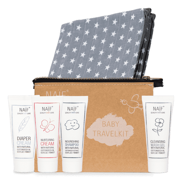 Ik ga op reis en neem mee… De Travel Kit! Ideaal voor op reis, vakantie of als je kroost uit logeren gaat. In de Naïf Travel Kit zitten vier handige producten, in reisformaat. Dus geen gezeur bij de douane. Ook fijn. Inclusief toilettas, gemaakt van recyclebaar karton. En we zijn nog niet klaar: je krijgt er ook een hydrofiele doek bij.