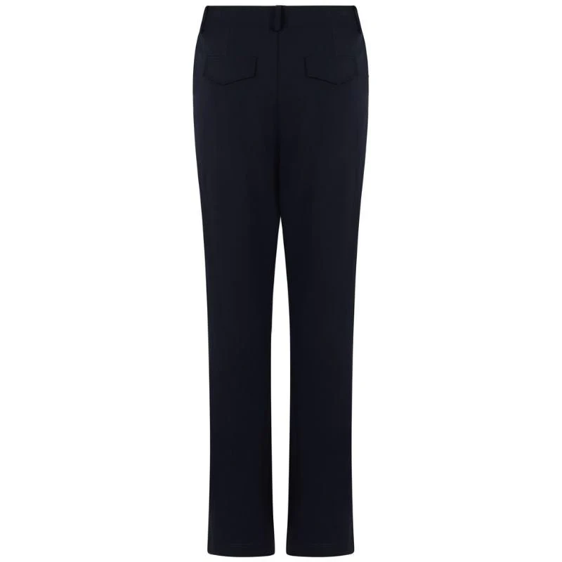 Night Blue sporty travel broek Macy van ZOSO voor dames. Deze broek heeft een moderne en sportieve uitstraling dankzij de diepe donkerblauwe kleur en de subtiele contraststrook langs de zijkant van de pijpen. De rechte pijpen zorgen voor een tijdloos en flatterend silhouet dat zowel comfortabel als vrouwelijk oogt. De gladde tailleband sluit mooi aan en geeft het geheel een verzorgde en minimalistische look.