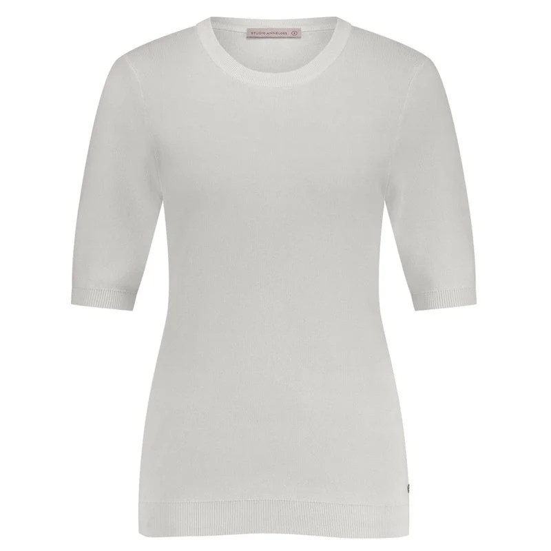 Offwhite basic pullover Lana ssl van Studio Anneloes voor dames. Deze tijdloze pullover is ontworpen met een ronde hals en korte mouwen en heeft een rustige en elegante uitstraling. De trui is gemaakt van een zachte Travel Knit kwaliteit die prettig aanvoelt op de huid en zorgt voor een comfortabel draaggevoel. Dankzij de regular fit valt de pullover soepel langs het lichaam zonder strak te zitten, wat dit item geschikt maakt voor dagelijks gebruik.