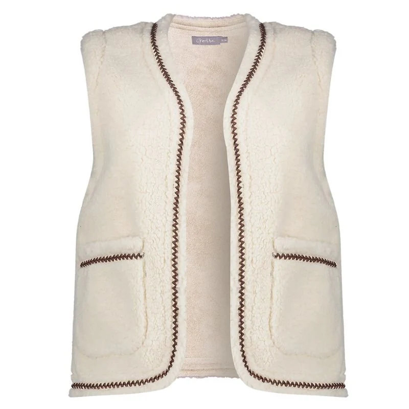 Offwhite teddy gilet met bies 55541 van Geisha voor dames. Dit stijlvolle gilet is gemaakt van een zachte teddykwaliteit die heerlijk comfortabel aanvoelt. Het mouwloze model heeft een rechtvallende pasvorm en is afgewerkt met geweven biesjes in een donkerbruine zigzagprint. Deze subtiele details geven het gilet een moderne en speelse uitstraling, terwijl de neutrale offwhite kleur ervoor zorgt dat je het eindeloos kunt combineren.