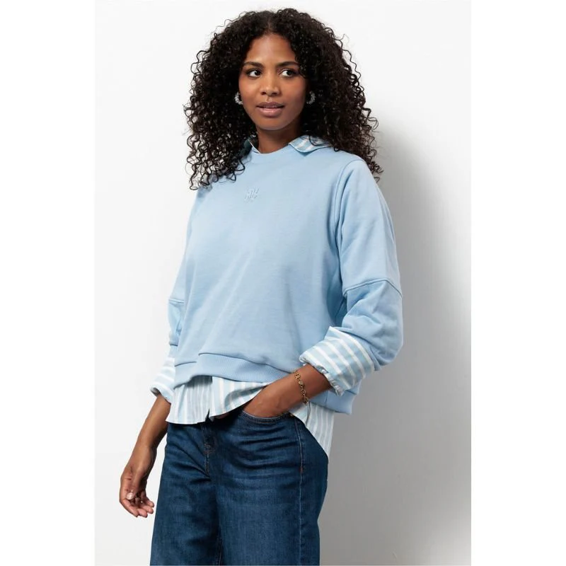 Pastel Blue studio sweater Pleuni van Studio Anneloes voor dames. Deze zachte sweater is ontworpen in een frisse pastelblauwe tint die direct een lichte en moderne uitstraling geeft aan je outfit. De ronde hals en comfortabele pasvorm zorgen ervoor dat de sweater prettig draagt gedurende de hele dag. De subtiel verlaagde schoudernaden en de geribde boorden geven het ontwerp een sportieve maar toch vrouwelijke look die moeiteloos aansluit bij verschillende stijlen.