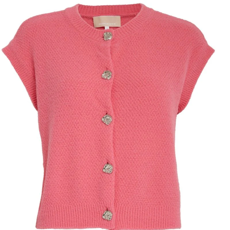 Pink Lemonade met zilveren knopen vest Naiza van Peppercorn voor dames. Dit opvallende vest in een frisse roze tint geeft je outfit direct een vrolijke en vrouwelijke uitstraling. De korte mouwen en de ronde hals zorgen voor een speelse, moderne look, terwijl de zilverkleurige knopen een luxe accent toevoegen. De combinatie van de zachte kleur en de glanzende details maakt dit vest een echte eyecatcher binnen je garderobe.