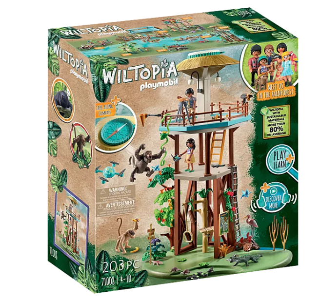 Nabij het dierenverzorgingsstation staat de onderzoekstoren, iets verhoogd, op een heuvel. Van daaruit hebben de Palmers niet alleen een prachtig uitzicht over het regenwoud en de Amazone, maar meet Sofia ook de luchtkwaliteit en de uitwisseling van vloeistoffen tussen de bomen vanaf het bovenste platform van de toren. De roterende reling maakt het gemakkelijk om de meetapparatuur in verschillende posities te verstellen. De windsnelheden worden ook vanaf daar gemeten. De meegeleverde drone helpt Rick om zeldzame brulapen vast te leggen voor zijn eigen video’s. En natuurlijk deelt Rick deze video’s ijverig op al zijn sociale media-accounts. Op het dak van de onderzoekstoren bevindt zich een afneembaar kompas dat kan worden meegenomen op excursies en wandelingen. De speelset bevat twee PLAYMOBIL-figuren, Sofia en Rick Palmer, een onderzoekstoren met een afneembaar kompas, een dierenkenniskaart, een drone, twee brulapen, kolibries, een kaaiman en vele andere spannende Amazone-dieren en spannende extra’s. Een extra portie kennis De Wiltopia-webapp biedt extra geweldige audio- en video-content en neemt kinderen mee naar de leefomgeving van de dieren. Scan eenvoudig de QR-code op de dierenverzamelkaart en de gedetailleerde dieren- en plantenwereld komt bij je thuis. Met de AR-functie is ook een selfie met de brulaap mogelijk. Zo werkt kennisoverdracht met plezier en heeft het een leereffect. Wiltopia – Prachtig voor het milieu Wiltopia is de eerste PLAYMOBIL-productlijn die gemiddeld voor meer dan 80% uit duurzaam materiaal bestaat. Gesorteerd plastic afval krijgt een nieuw leven en dient als materiaalbron voor deze bijzondere spelwereld. Dit spaart grondstoffen en vooral het milieu. Uiteraard voldoen alle producten van Wiltopia aan de gebruikelijke hoge veiligheidsnormen en de bewezen PLAYMOBIL kwaliteit en duurzaamheid