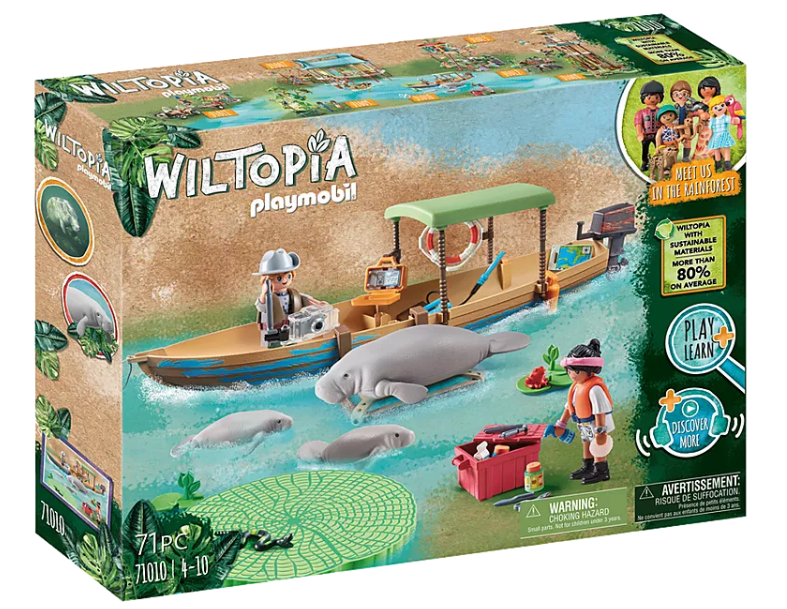 De Palmers reizen per boot door de Amazone om de dierenwereld en de natuur te ontdekken en om onderwater foto’s te kunnen maken met hun waterdichte camera. Ook controleren ze vanaf de boot de waterkwaliteit. Tijdens hun onderzoeksreizen ontdekken ze een zeekoeienmoeder met haar tweeling, wat zeer zeldzaam is voor lamantijnen. De lamantijnmoeder heeft echter een gewonde vin. Ze nemen haar mee op de transportsteun van de boot naar het dierenverzorgingsstation, waar Dr. Da Silva en Jamie de lamantijn behandelen en hem dan weer in goede gezondheid loslaten in de Amazone. De boot heeft een buitenboordmotor en een paviljoendak en kan drijven. Naast een doos met veel veterinaire accessoires wordt ook een stickervel met verbandlabels voor het verzorgen van de dieren meegeleverd. De nieuwe lamantijnfiguren kunnen drijven en hebben een beweegbare staartvin. De set bevat twee PLAYMOBIL-figuren Dr. Da Silva en Jamie Palmer, een boot, een lamantijn met twee welpen, een onderwatercamera, meetapparatuur, veterinaire accessoires en nog veel meer extra’s voor spannende Amazone-avonturen. Een extra portie kennis De Wiltopia-webapp biedt extra geweldige audio- en video-content en neemt kinderen mee naar de leefomgeving van de dieren. Scan eenvoudig de QR-code op de dierenverzamelkaart en de gedetailleerde dieren- en plantenwereld komt bij je thuis. Met de AR-functie is ook een selfie met de lamantijn mogelijk. Zo werkt kennisoverdracht met plezier en heeft het een leereffect. Wiltopia – Prachtig voor het milieu Wiltopia is de eerste PLAYMOBIL-productlijn die gemiddeld voor meer dan 80% uit duurzaam materiaal bestaat. Gesorteerd plastic afval krijgt een nieuw leven en dient als materiaalbron voor deze bijzondere spelwereld. Dit spaart grondstoffen en vooral het milieu. Uiteraard voldoen alle producten van Wiltopia aan de gebruikelijke hoge veiligheidsnormen en de bewezen PLAYMOBIL kwaliteit en duurzaamheid
