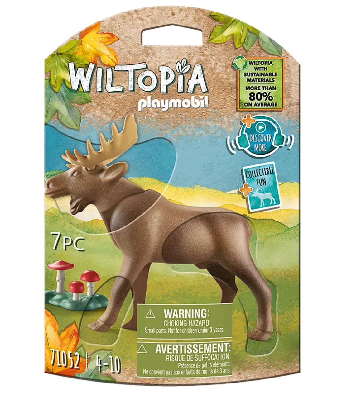 Elanden zijn de reuzen onder de herten. Alleen al hun machtige gewei kan meer dan 35 kg wegen – zoveel als een volwassen herdershond! De eland zelf kan het gewicht van een kleine auto bereiken en tot 3 meter lang en meer dan 2 meter hoog worden. Het past dus net door een normale deur! Elanden zijn pure herbivoren en leven uitsluitend in moerassige loofbossen. Wiltopia nodigt kinderen uit om spannende gebieden van onze wereld te ontdekken die het waard zijn om te beschermen, waaronder hun talrijke dierlijke bewoners. Bovendien combineert het spelen en leren op een unieke manier. De PLAYMOBIL-set bevat een eland, een paddenstoel en een dierenkenniskaart. De eland kan zijn kop op en neer bewegen.