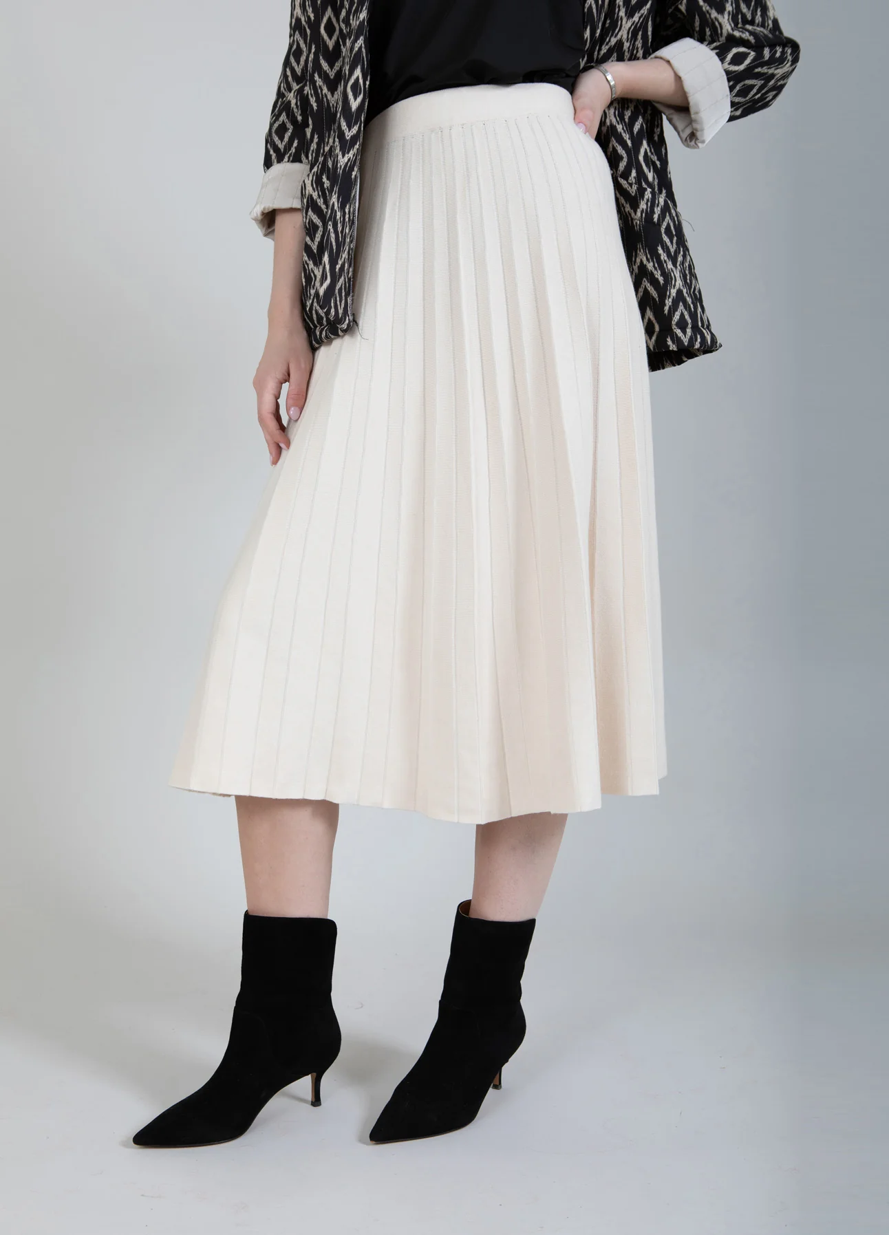 Mid-length skirt in a loose fit that brings out its fine pleated details.