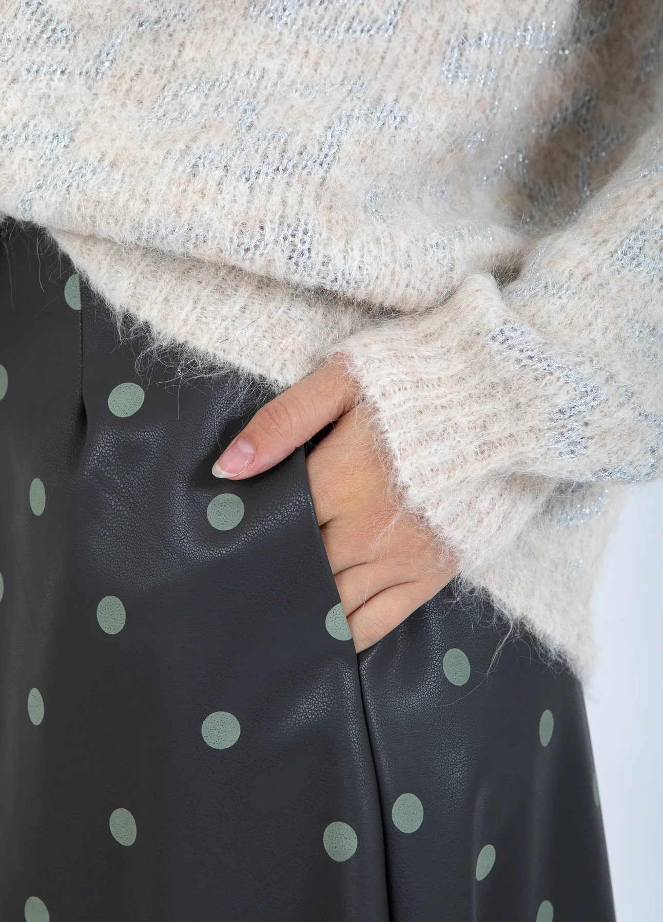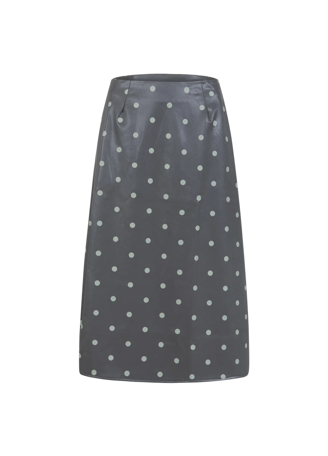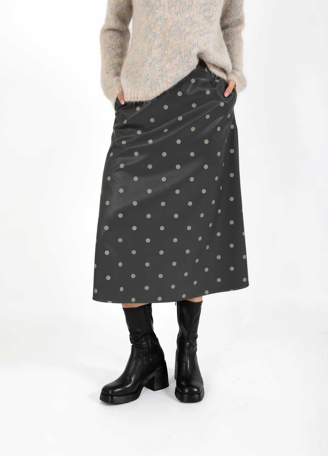 Deze PU-rok is een moderne keuze met zijn gedurfde polkadotprint. Het A-lijn silhouet zorgt voor een flatterende look, terwijl het licht glanzende PU-materiaal een edgy tintje geeft aan je outfit. Perfect voor een avondje uit in de stad of om je dagelijkse stijl op te fleuren.
