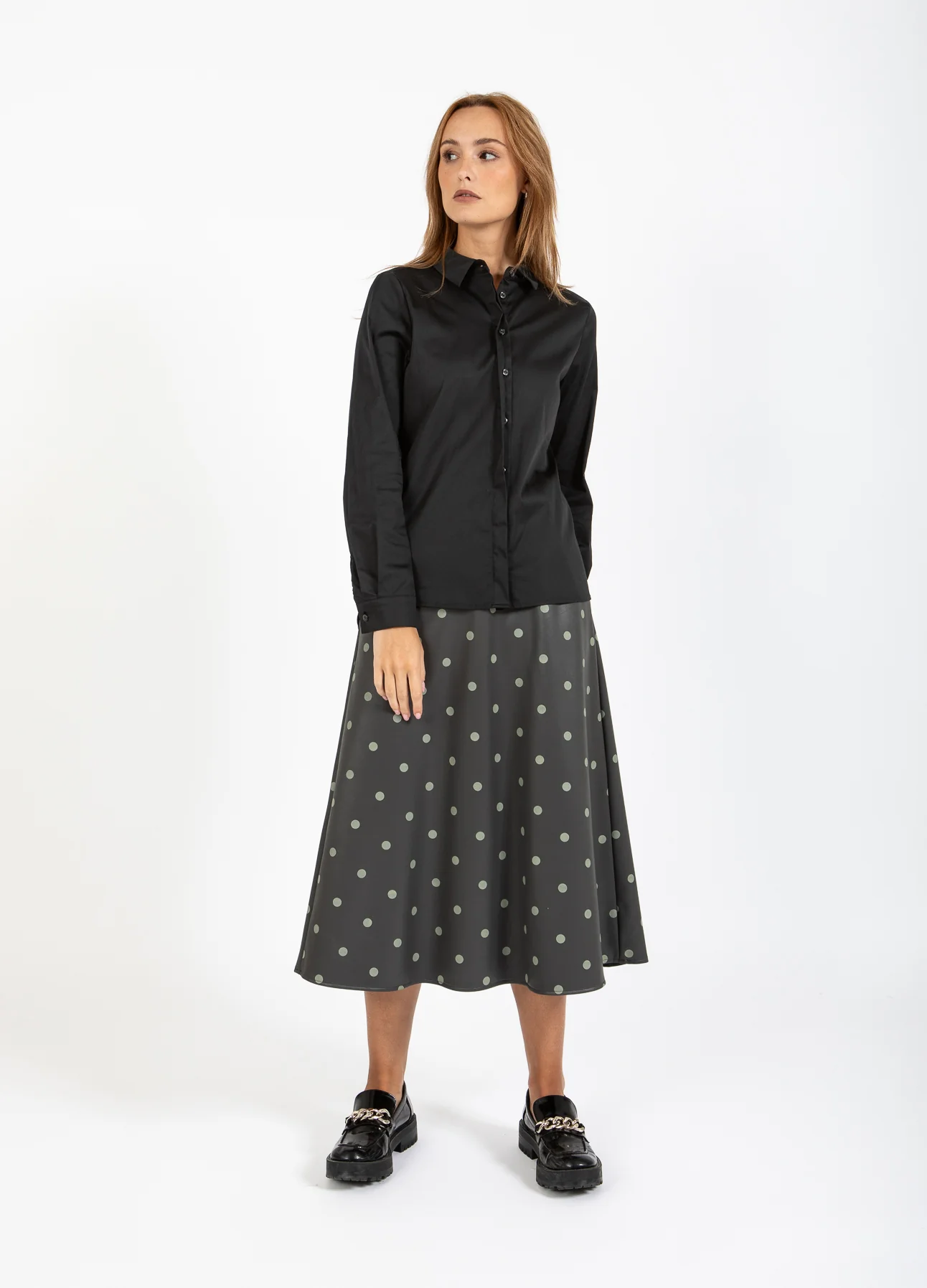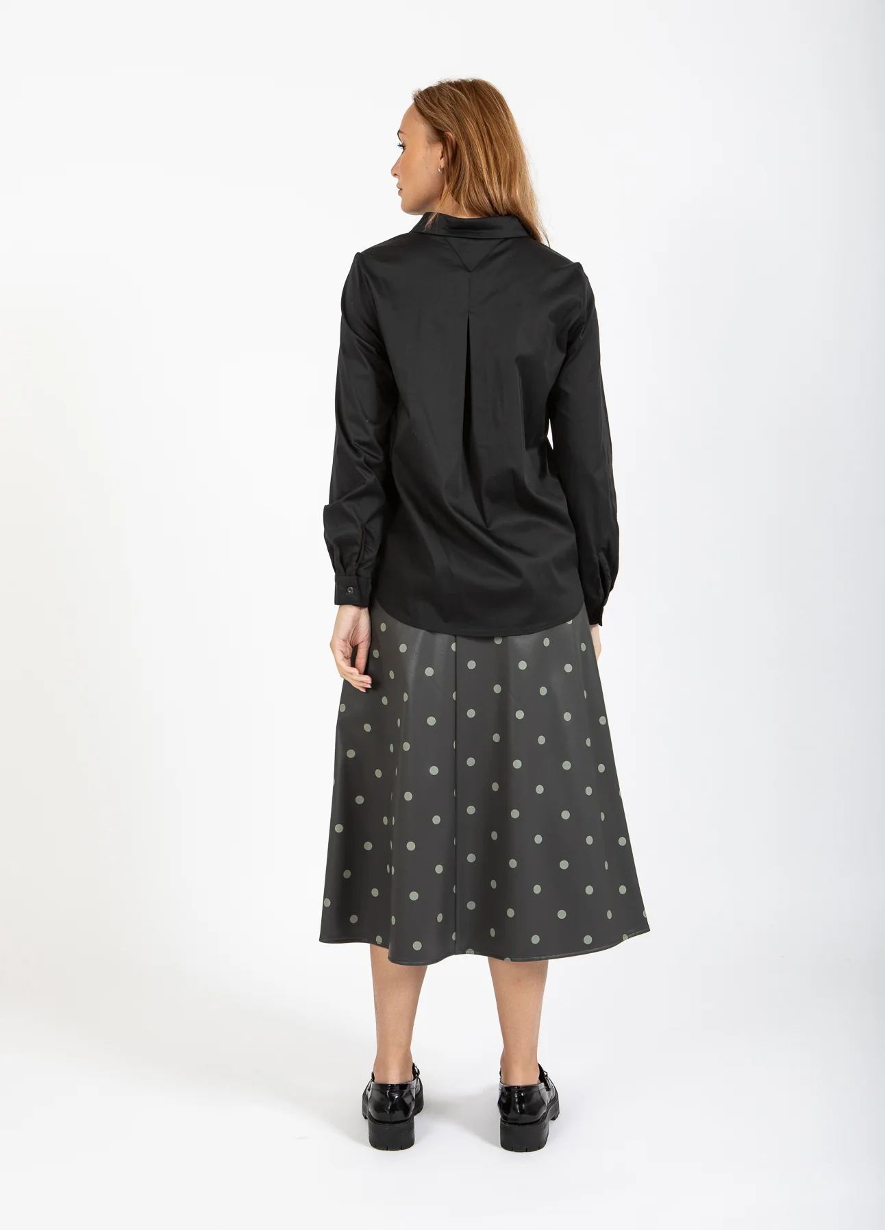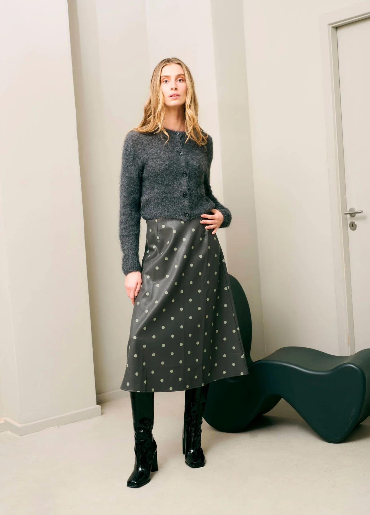 Deze PU-rok is een moderne keuze met zijn gedurfde polkadotprint. Het A-lijn silhouet zorgt voor een flatterende look, terwijl het licht glanzende PU-materiaal een edgy tintje geeft aan je outfit. Perfect voor een avondje uit in de stad of om je dagelijkse stijl op te fleuren.