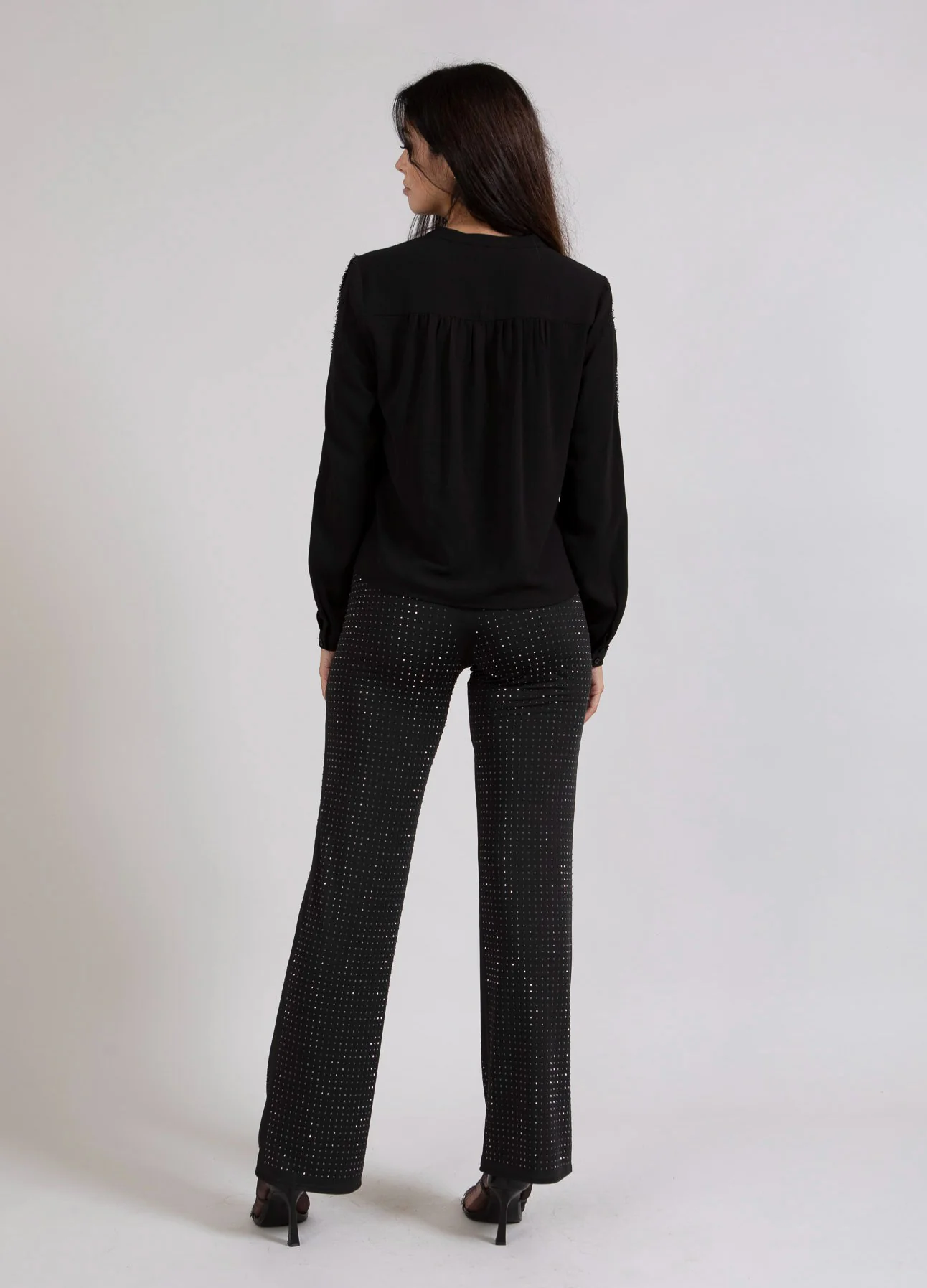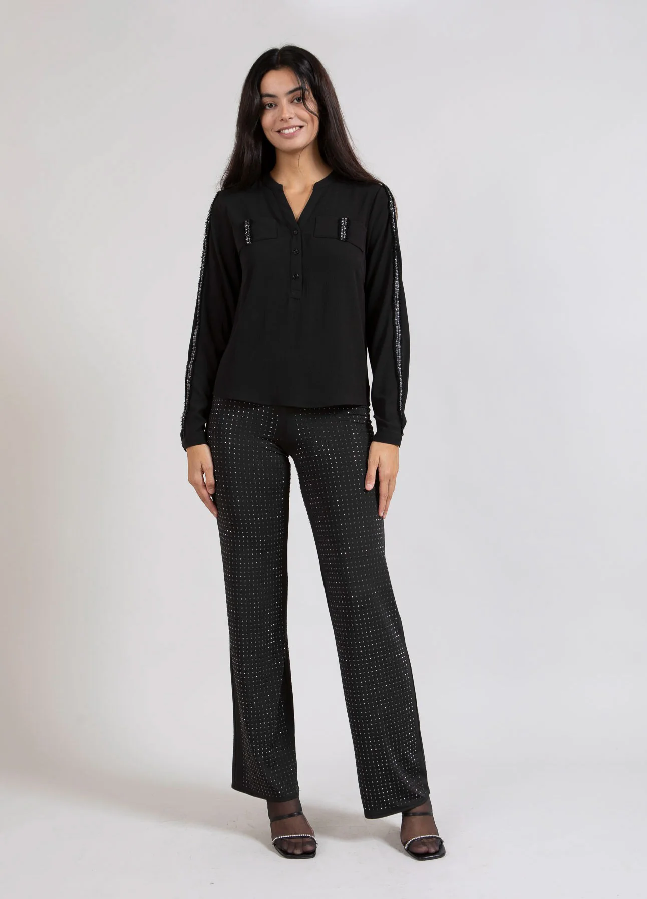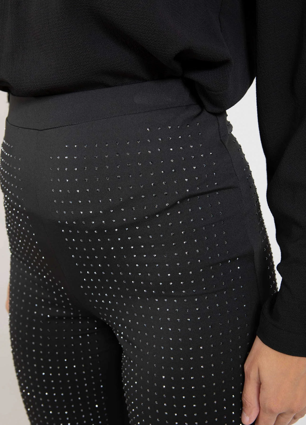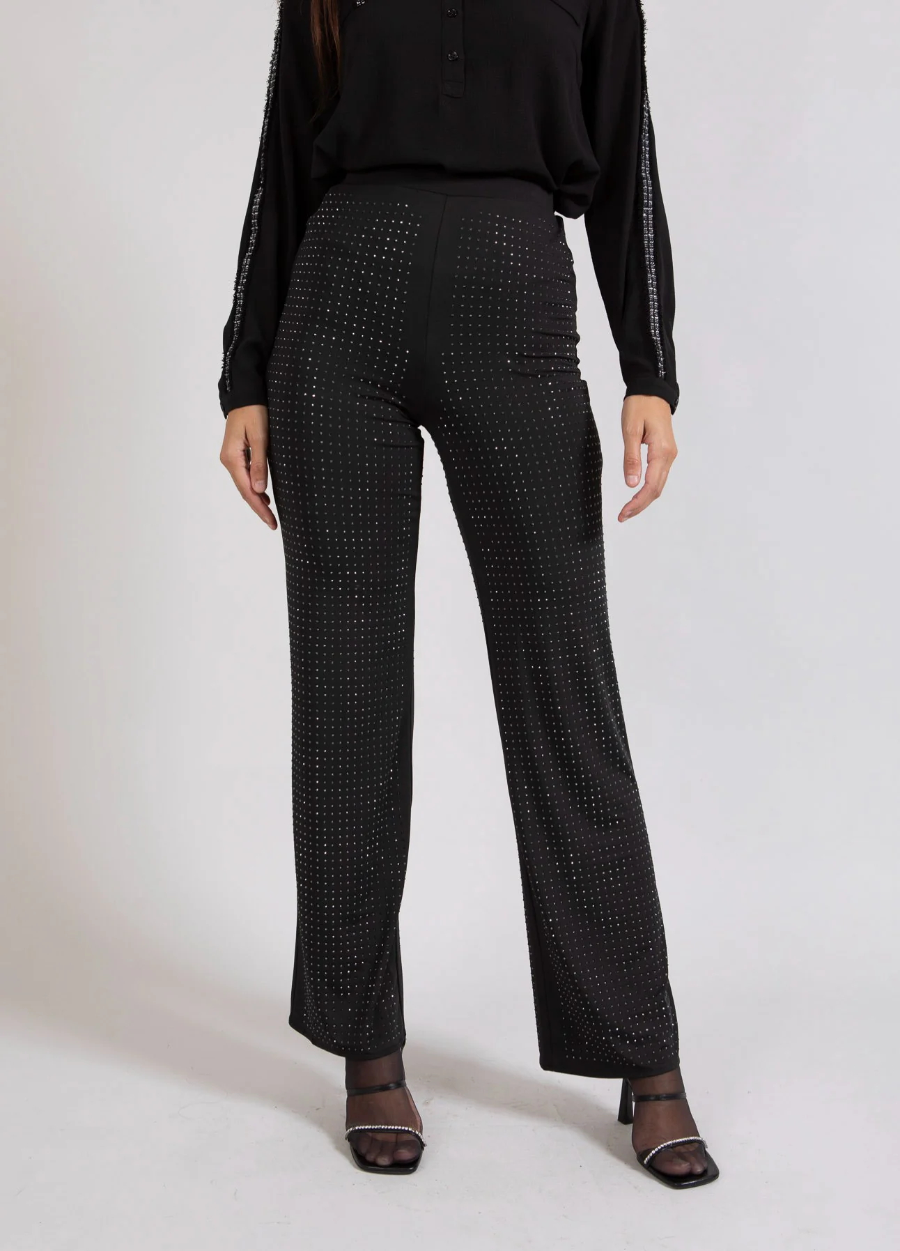 Rechte broek van elastische kwaliteit met strass. Perfect voor een ingetogen feestoutfit. Kan elke blouse opfleuren.