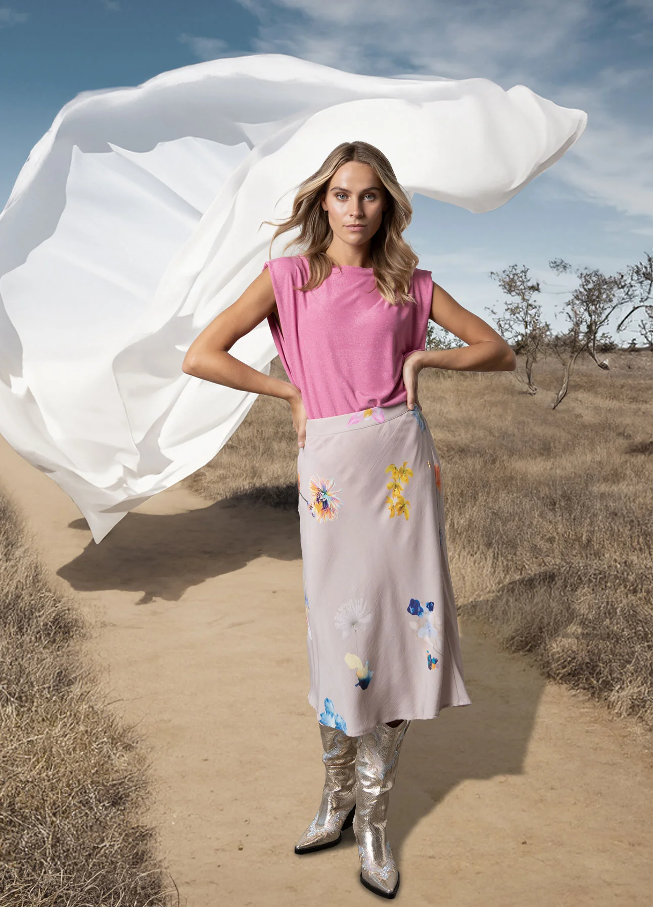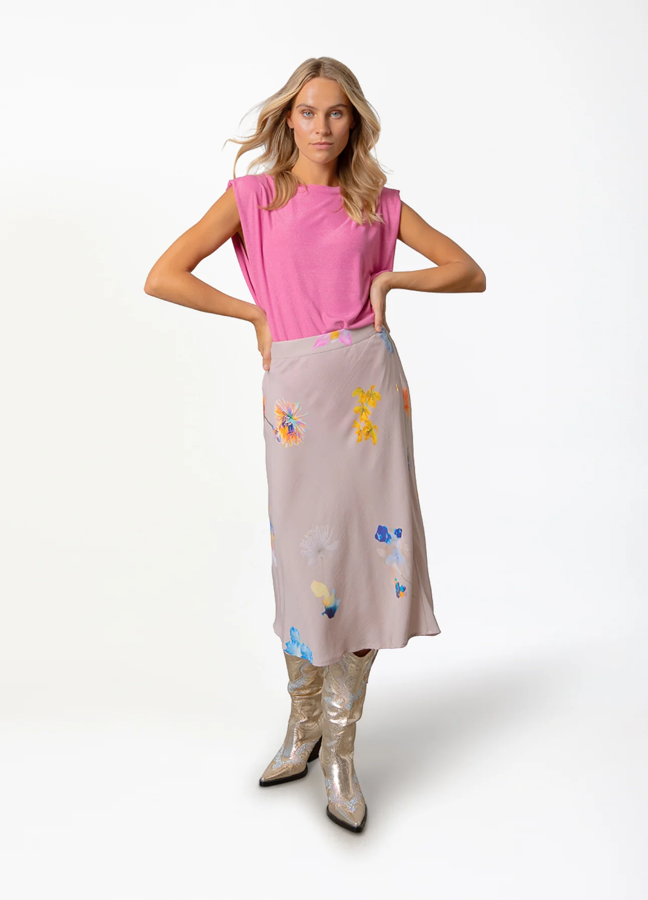 Het model is 174 cm lang en draagt maat S. Haar maten zijn 82 cm rond de buste, 62 cm rond de taille en 89 cm rond de heupen.