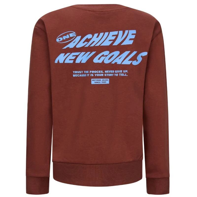 Roodbruine backprint sweater Kelto van Retour Jeans voor jongens. Deze crewneck sweater uit de wintercollectie is een absolute musthave voor jongens die houden van een stoere en sportieve look. Het model is uitgevoerd in een warme roodbruine kleur en heeft een comfortabele pasvorm met lange mouwen en een ronde hals. Op de borst en rug staat een witte print met de inspirerende tekst “Achieve new goals”, wat de trui een moderne en krachtige uitstraling geeft. Perfect voor schooldagen, chillen in het weekend of gewoon een dagje buiten spelen.
