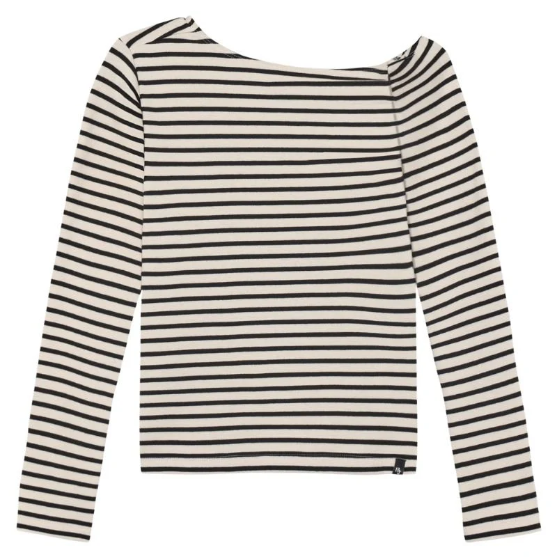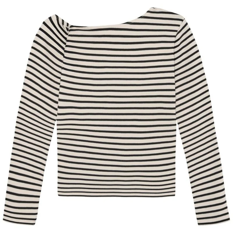 Sandshell gestreepte longsleeve 970615 van Indian Blue Jeans voor meiden. Deze longsleeve heeft een trendy en speelse uitstraling dankzij het klassieke zwart witte streeppatroon en het off shoulder model. De brede halslijn geeft het shirt een modieuze twist en zorgt voor een nonchalante look die perfect past bij meiden die graag iets anders dragen dan een basic top.