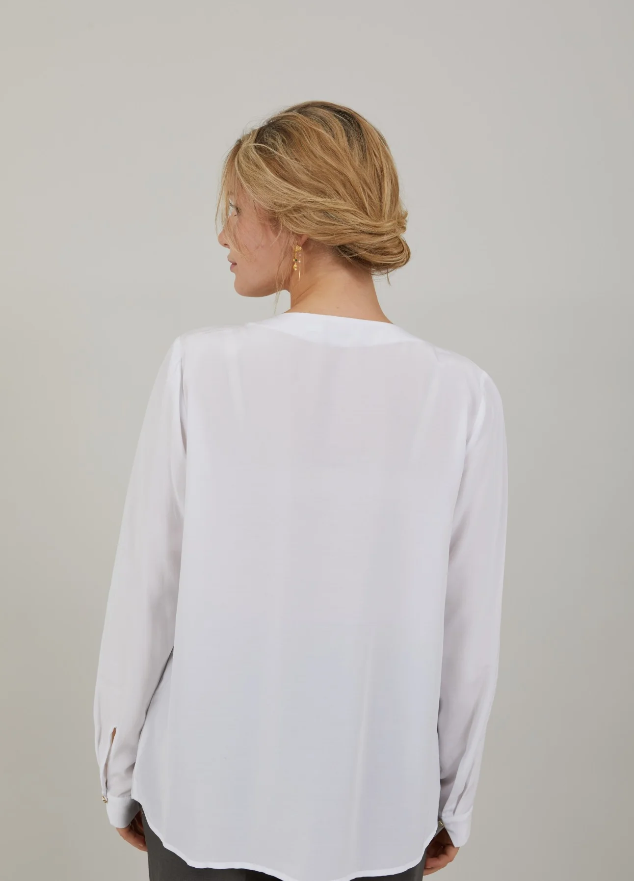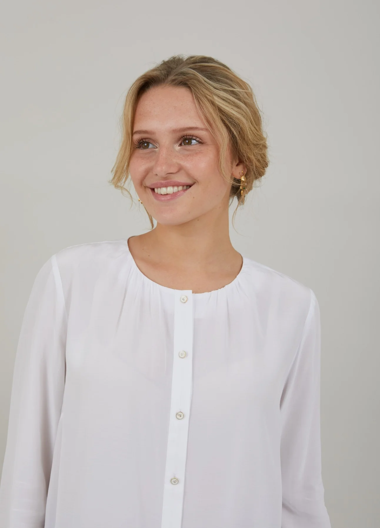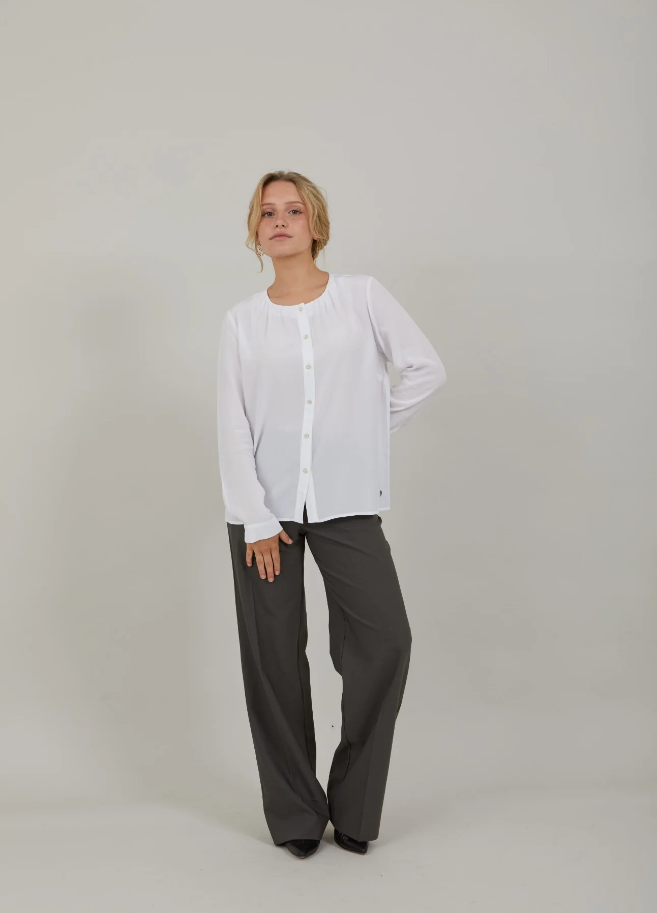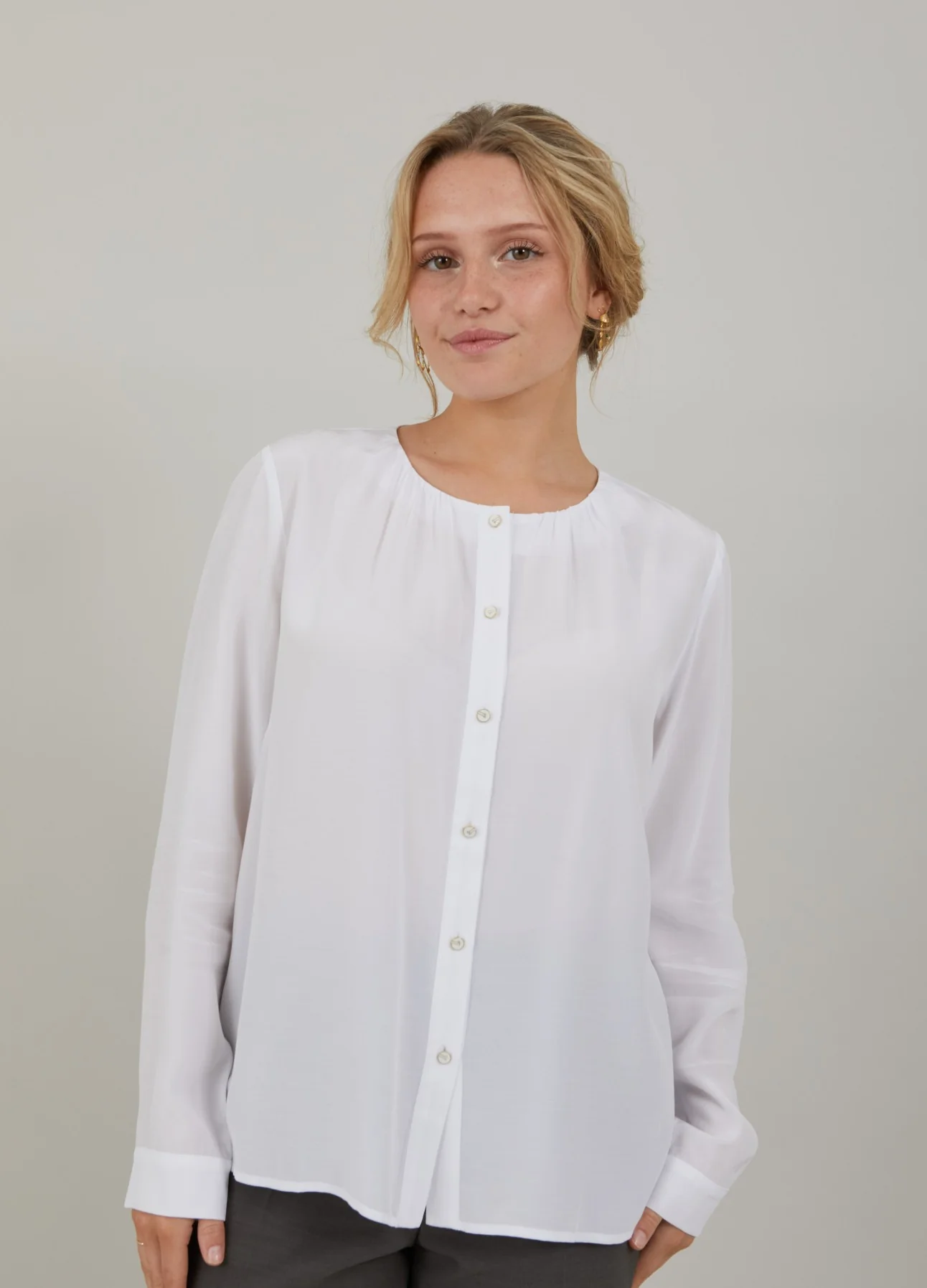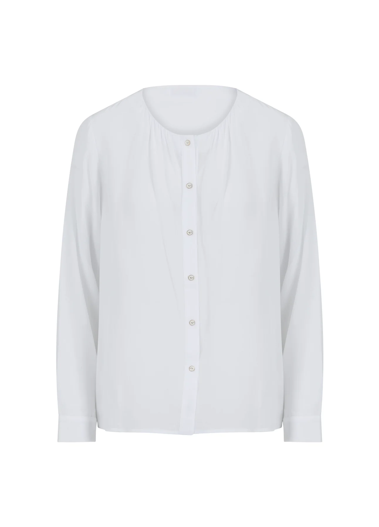 Shirt met fijne rimpels in de hals, ronde halslijn en knoopsluiting.