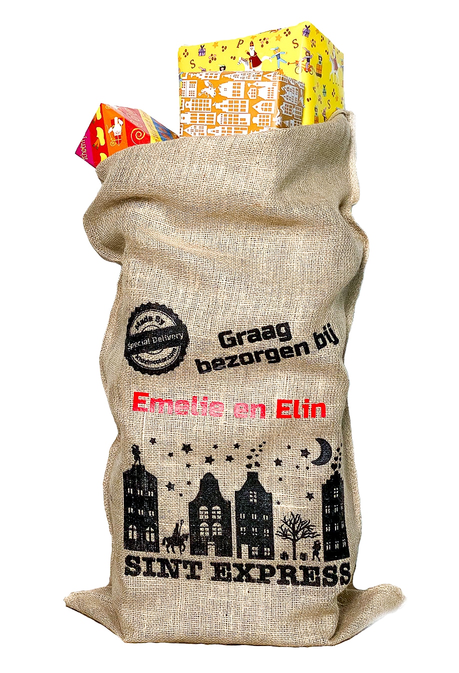 - Gepersonaliseerd: jouw familienaam wordt duidelijk gedrukt op de jute zak, waardoor hij meteen herkenbaar is.