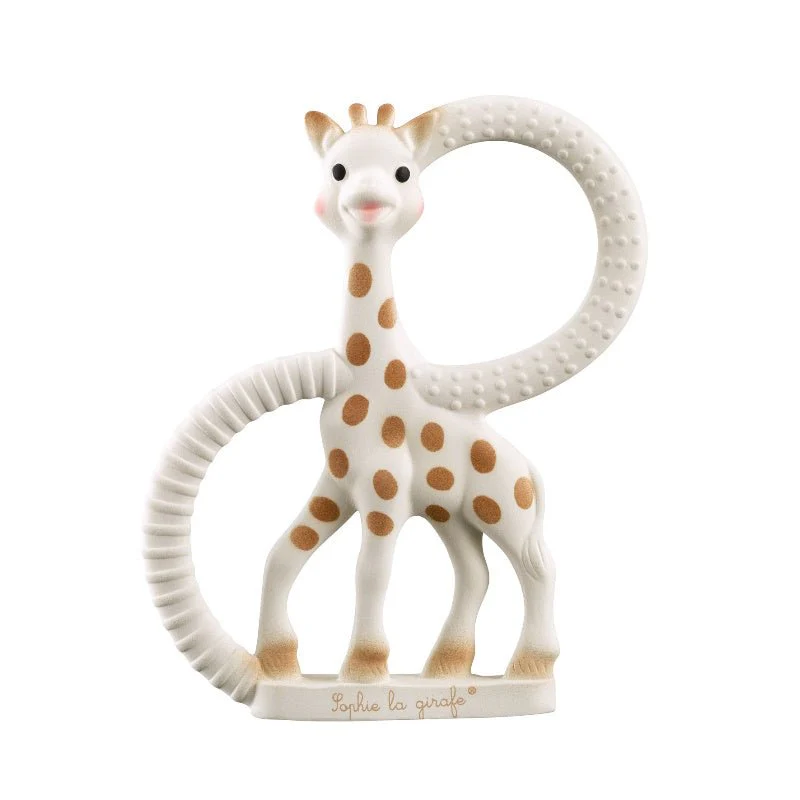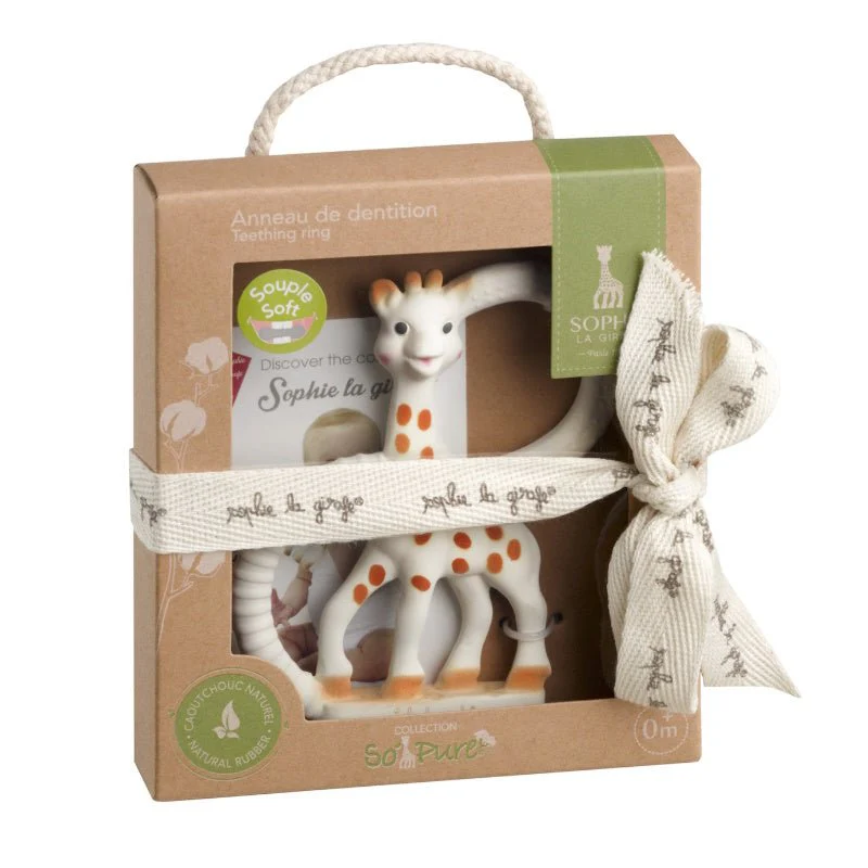 So’Pure bijtring soft van Sophie de giraf voor kinderen. Deze soft bijtring is gemaakt van 100% natuurlijk rubber afkomstig van de Hevea boom. Bewerkt met verf die gebruikt wordt in de voedingsmiddelenindustrie. Vrij van schadelijke stoffen zoals PVC, Phthalaten, BPA en andere weekmakers, het is een veilig en duurzaam speeltje. Perfecte bijtring om het pijnlijke tandvlees van jouw kindje te verzachten. Een bijtring is gezond en ideaal voor het verzachten van de pijn tijdens het doorkomen van de melktandjes. Bevat een gestreept oppervlak voor de doorbrekende tanden en bolletjes om het tandvlees te verzachten. Verpakt in een bruin geschenkdoosje, dus ook leuk om te geven.