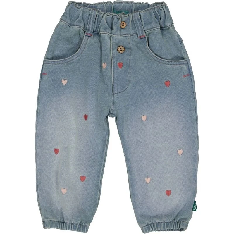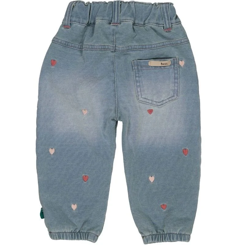 Stone Wash broekje Jog Denim 261045 van Bess voor baby meisjes. Dit jog denim broekje combineert het stoere uiterlijk van denim met het zachte comfort van een joggingbroek en is daardoor ideaal voor dagelijks gebruik. De stone wash wassing geeft het broekje een lieve en speelse uitstraling, terwijl de kleine hartjesprint zorgt voor een subtiel en schattig detail dat perfect past bij baby meisjes.