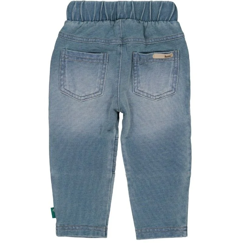 Stone Wash jogpant Denim 261012 van Bess voor baby jongens is een comfortabele en stoere broek die perfect is voor dagelijks gebruik. Deze jogpant is gemaakt van een zachte denimkwaliteit met stretch waardoor hij prettig aanvoelt op de huid en voldoende bewegingsvrijheid biedt tijdens spelen kruipen en ontdekken. De stone wash wassing geeft de broek een tijdloze denimlook die makkelijk te combineren is met verschillende shirts en truien.